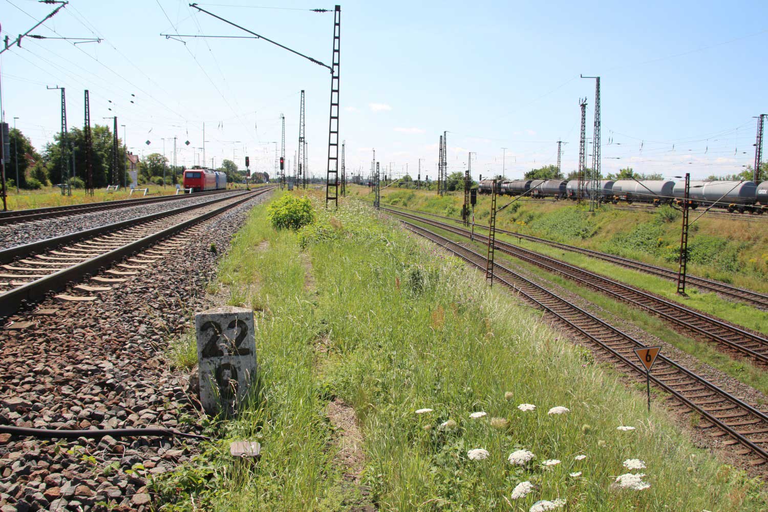 km 234,4 (Stein und Tafeln) der Hauptstrecke - Blick Richtung Halle (Saale)