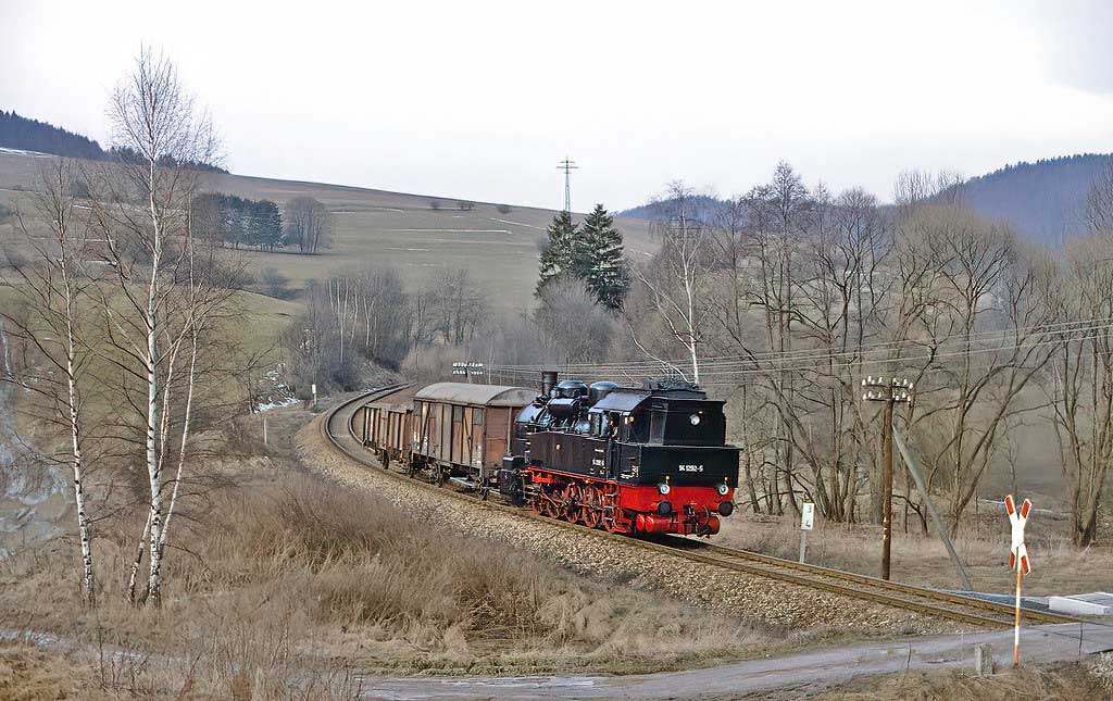 95 027 mit Güterzug bei der Ausfahrt im Bf Ernstthal am Rennsteig am km 23,6
