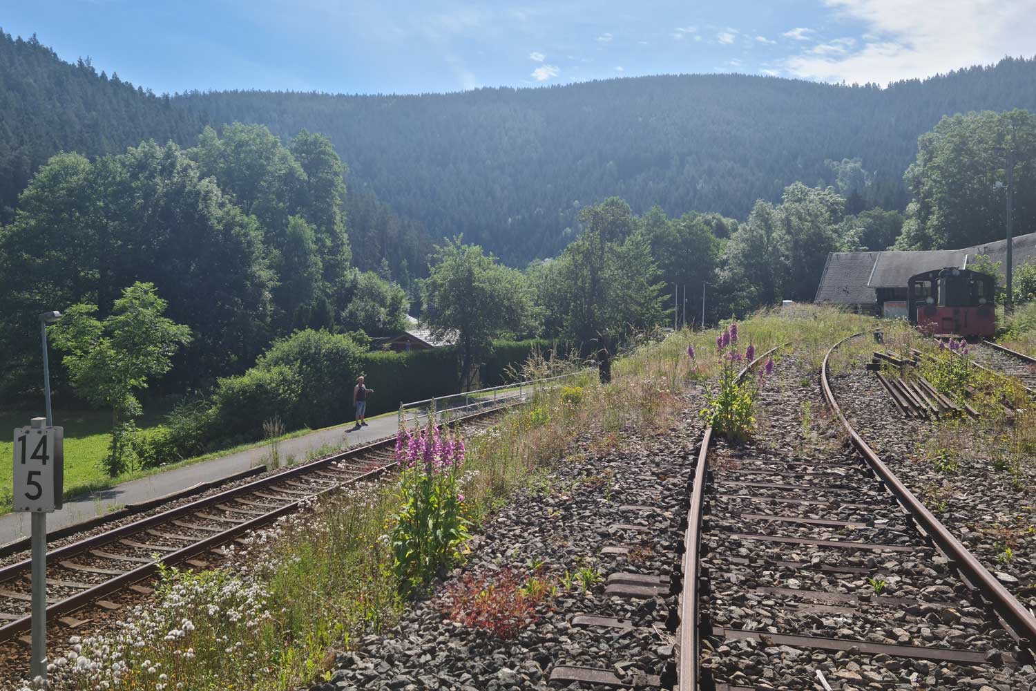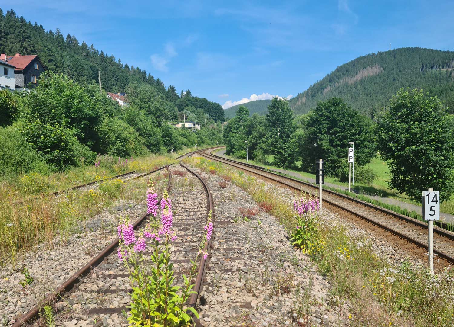 Links verläuft das Gleis in Richtung Königsee (Thür)