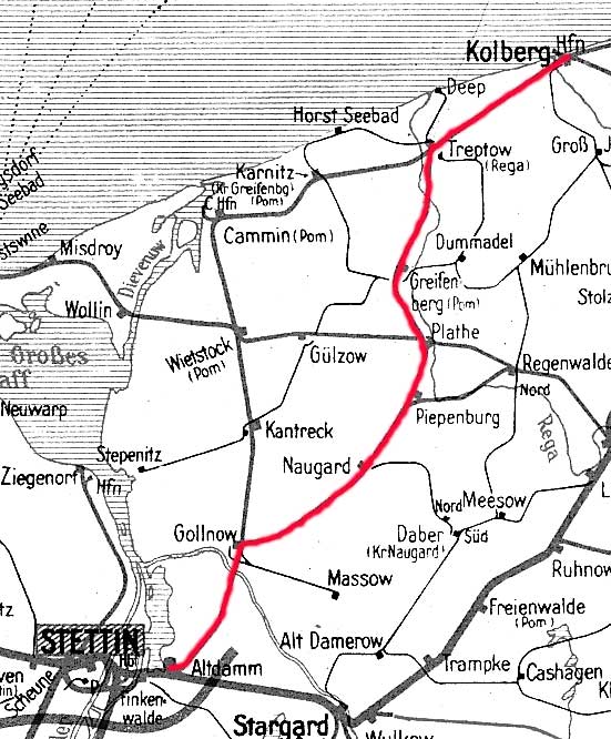Koszalin (Köslin) 0,0 - Kołobrzeg (Kolberg) 42,432 - Trzebiatów [Treptow (Rega)] 66,711 - Gryfice [Greifenberg (Pom)] 85,570 - Goleniów (Gollnow) 142,131