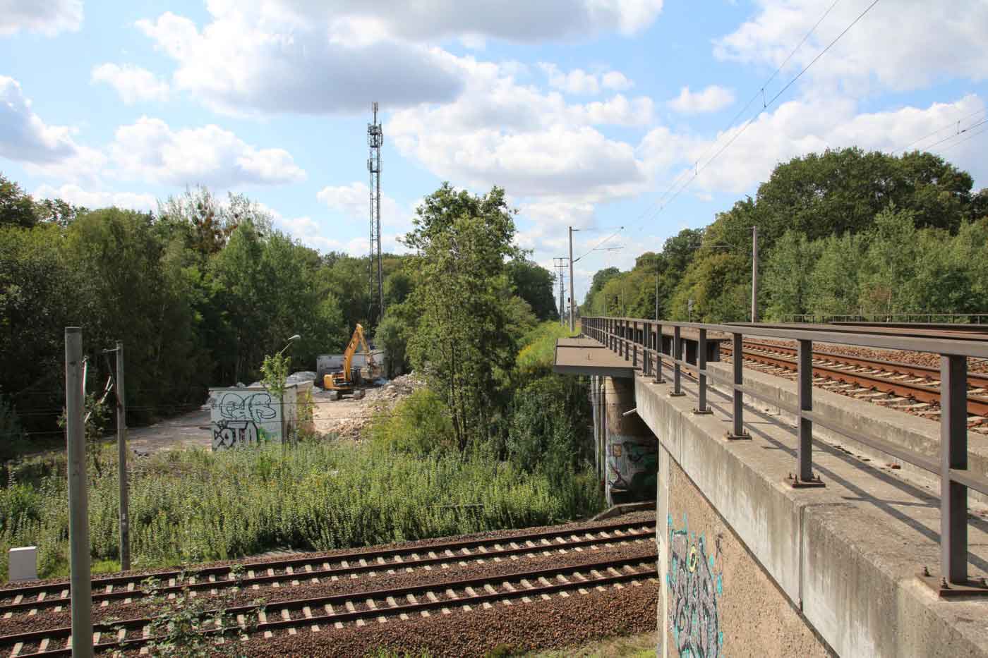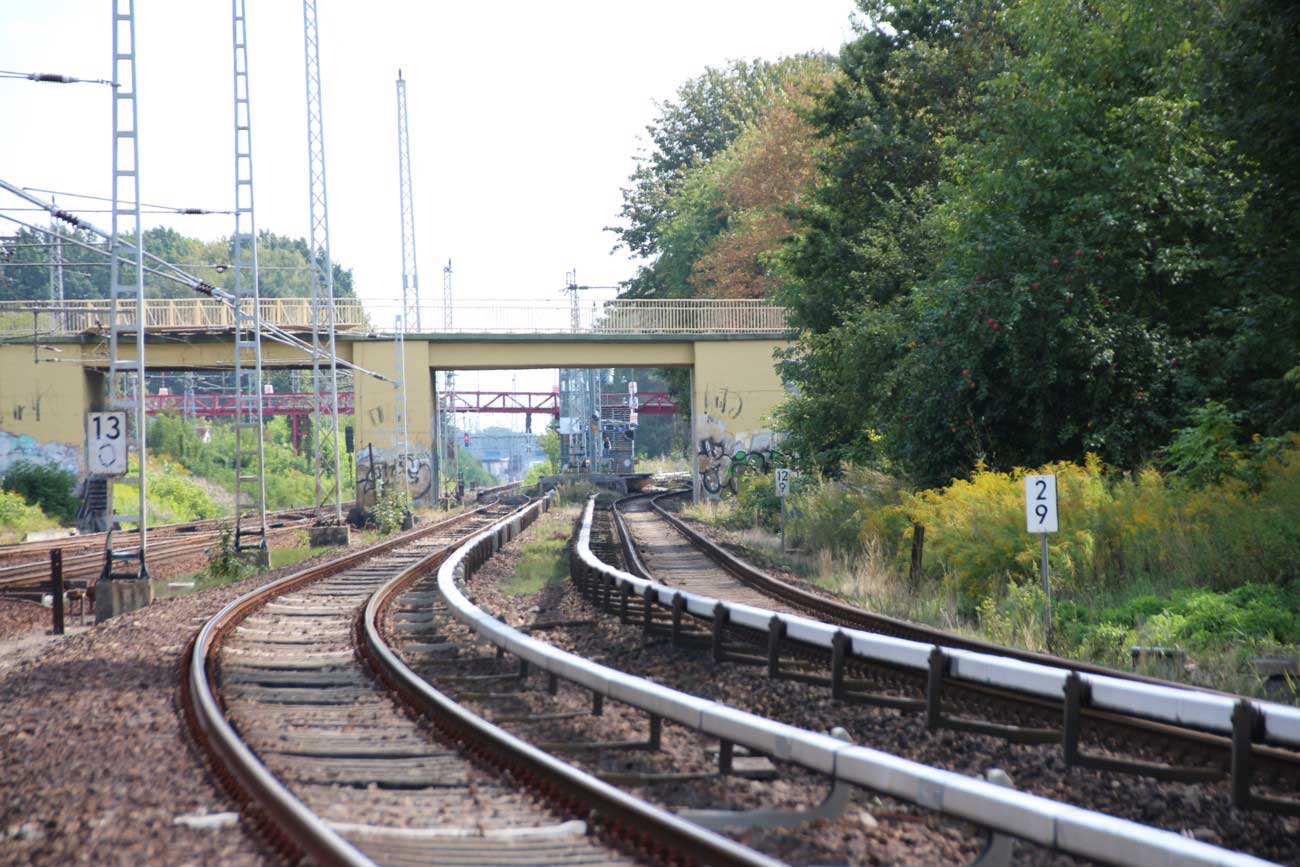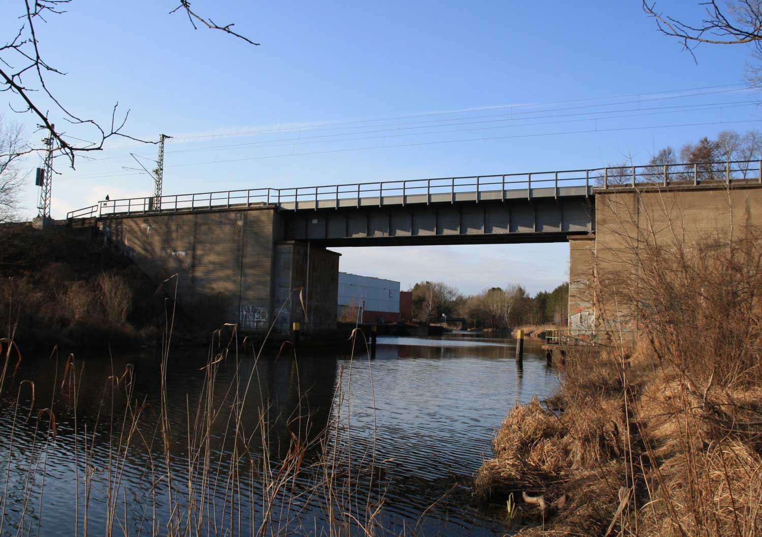 Über die Brücke im Hintergrund führen drei Gleise der Lehrter Bahn (1 Gleis Strecke 6107 und 2 Gleise Strecke 6185)