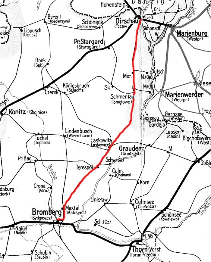 Maxtal 9,531 km 33,450 der Strecke Groß Neudorf 0,0 - Karlsdorf Transit (ab 1942: Bromberg Ost) 20,656 - Lindenbusch 71,299 - Berent (Westpr) 137,196 - Gotenhafen 204,560