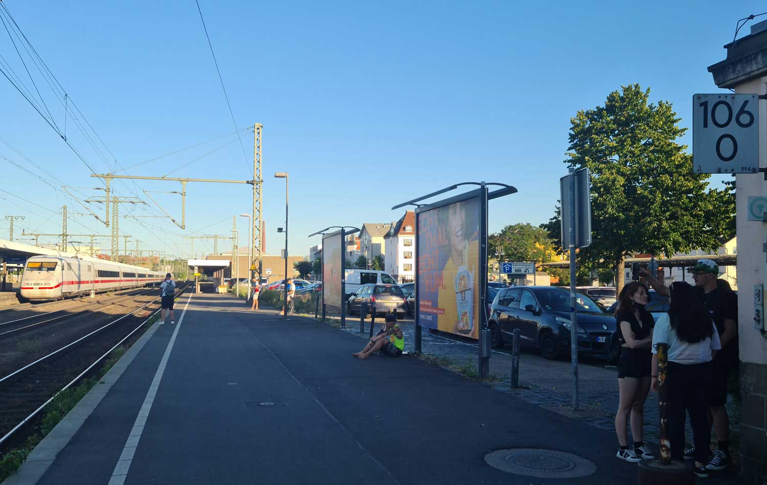 km 133,97 der Strecke Kassel Hbf 0,0 - Gießen 133,97 - Friedberg (Hess) 166,07 - Frankfurt (Main) West 196,46; 1978 verlängert bis Frankfurt (Main) Hbf 199,79 | ||