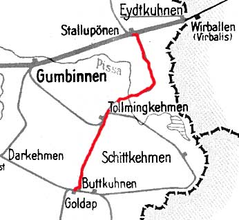 km 731,21 der Strecke Berlin Schlesischer Bf 0,0 - Küstrin Neustadt 84,72 - Kreuz 187,28 - Schneidemühl Pbf 245,66 - Dirschau 426,10 - Elbing 472,55 - Königsberg (pr) Hbf 591,15 (kommend)/588,87 (gehend) - Insterburg 680,25 - Eydtkuhnen 741,73 - Reichsgrenze 742,33 - [Wirballen (Virbalis) - Kaunas (Kowno) - Wilna (Wilno)] | ||