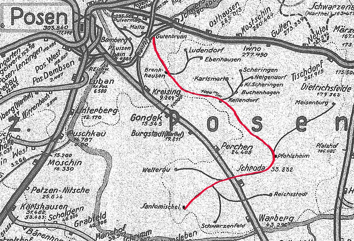 Stand der Kilometrierung: nach 1945 Poznań Kobylepole (Gutenbrunn/Stutenfeld) 0,0 - Tulce (Brenkhausen)