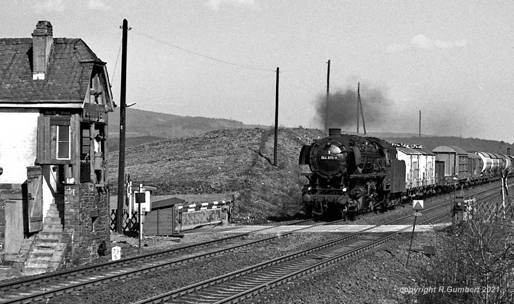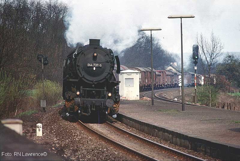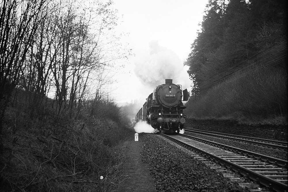 044 482 des Bw Ehrang mit ihrem Güterzug. Die letzte Untersuchung lautete „Sr 7.5.67“, am 08.01.74 ging sie zum Bw Gelsenkirchen-Bismarck um dort nach etwa einem Jahr, am 29.01.75 auf Z gestellt und am 18.05.75 ausgemustert zu werden.