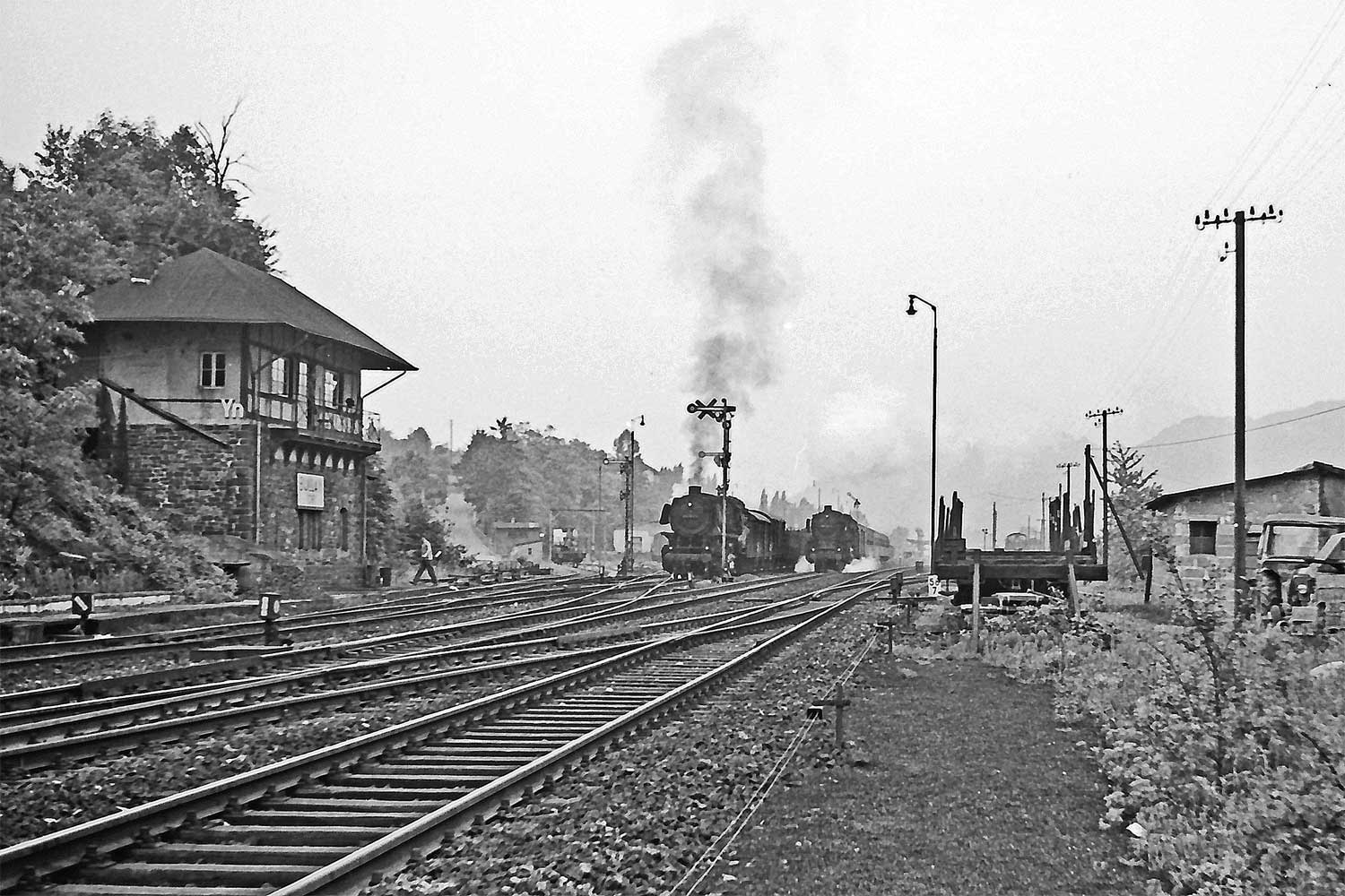Weiterhin beachtenswert im Hintergrund die Telegrafenleitungen, die bis auf zwei Aderpaare wegen des Tunnels in Kabel übergehen.