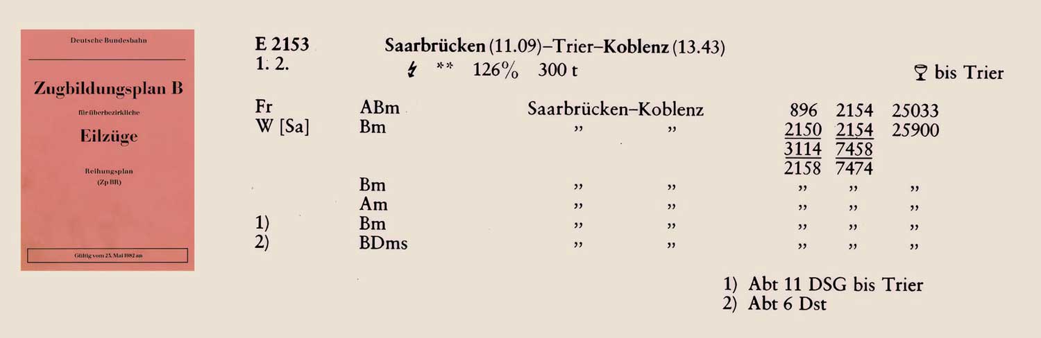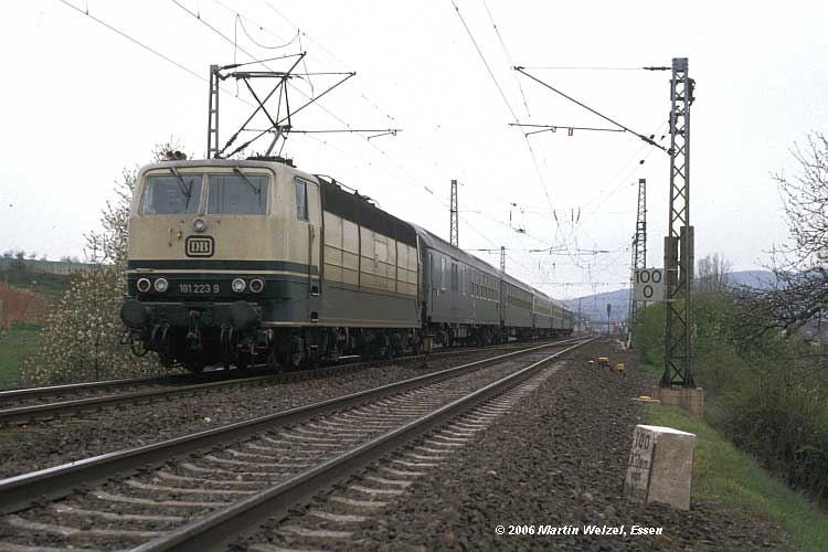 Koblenz Hbf 0,0 - Trier Hbf 111,57 - Perl 159,05 - Grenze Deutschland/Frankreich 159,512 = [km 22,176 - Apach 21,157 - Thionville (Diedenhofen) 0,0] (1980)