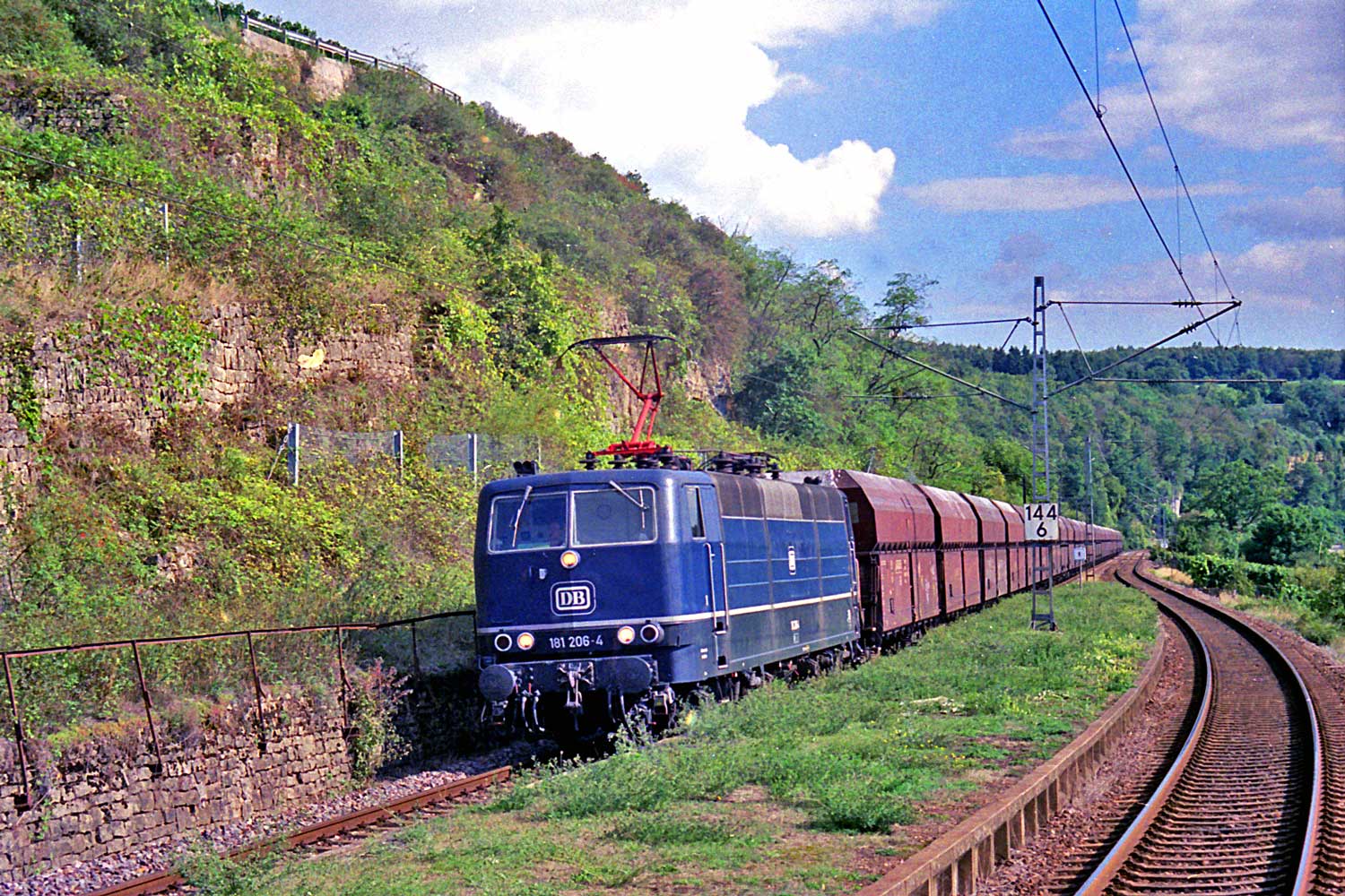 km 151,2 bei Nennig - 051 922 mit einem Güterzug auf der Fahrt nach Frankreich