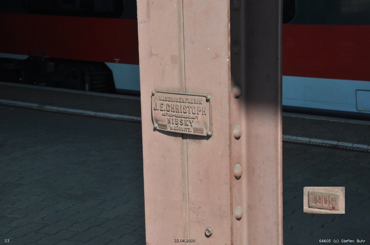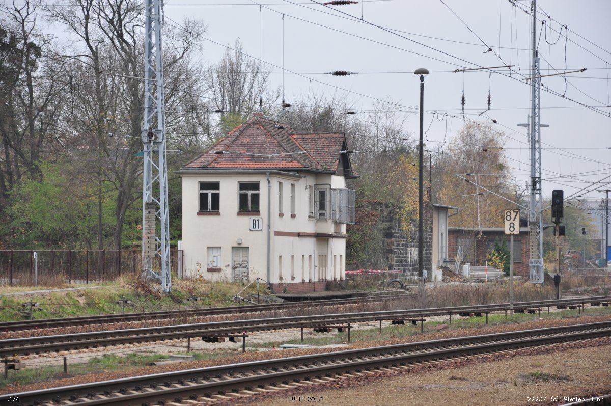 Roßlau (Elbe) | 233,67 | km 17,94 der Strecke (Biederitz 0,68 - Güterglück 25,87 - Landesgrenze Preußen/Anhalt km 30,320) = km 0,0 - Dessau Hbf 22,96 - Bitterfeld 48,51 - Leipzig Hbf 81,26 |