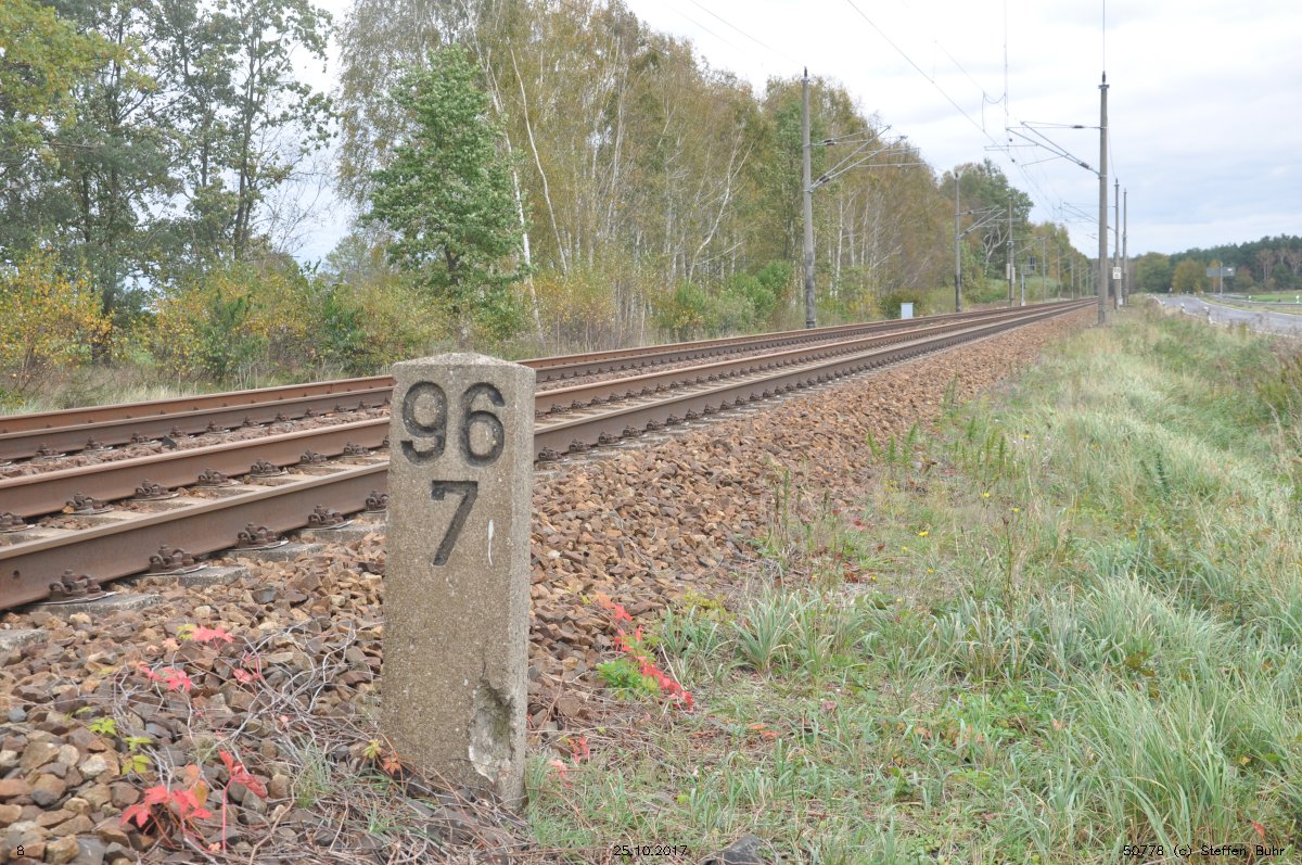 km 96,6 (Tafel) und km 96,7 (Stein) zwischen Schwarzbach (b Ruhland) und Ruhland