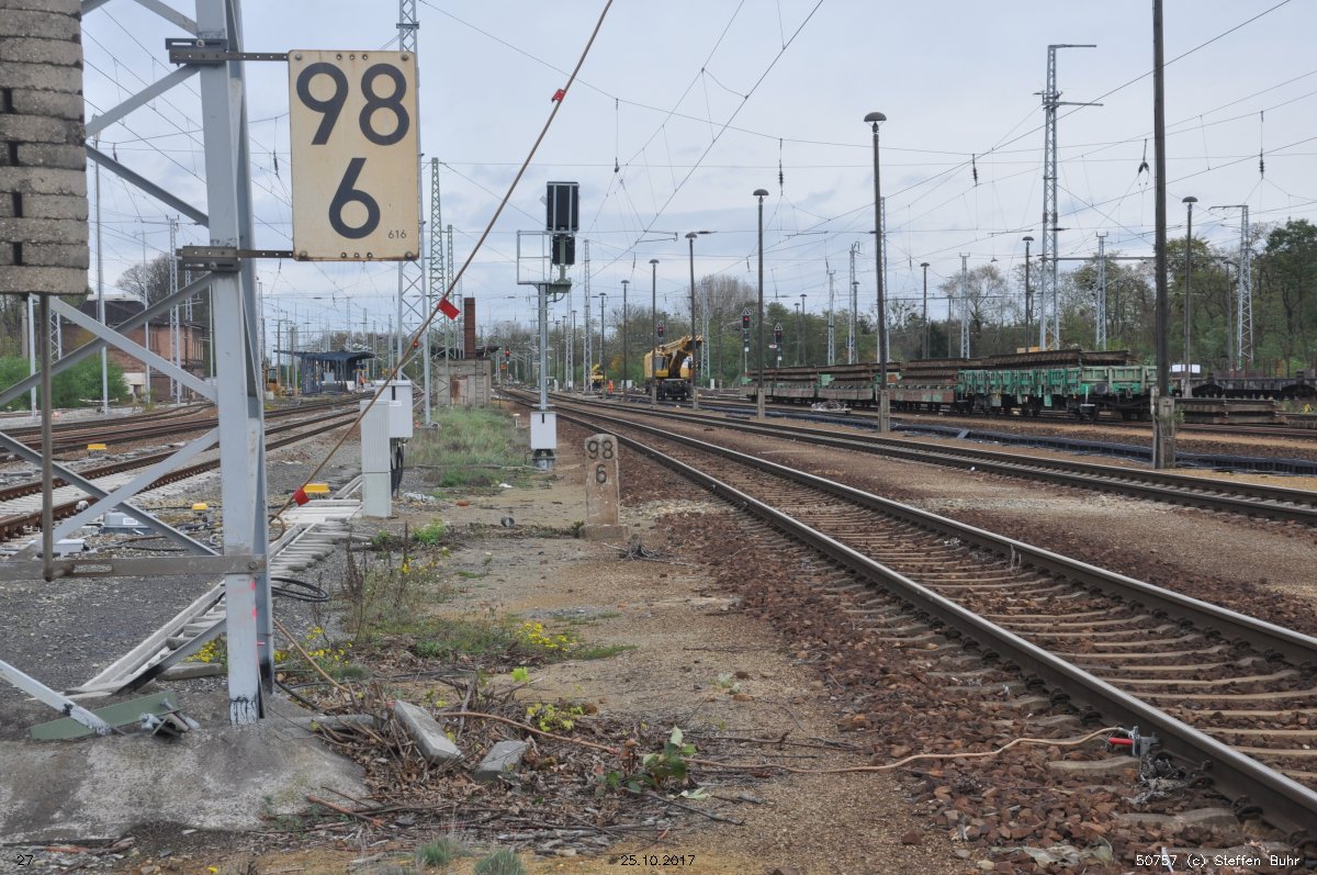 Ruhland | 98,32 | km 32,92 der Strecke Großenhain Cottb. Bf 0,0 - Senftenberg 45,29 - Cottbus 79,67 - Frankfurt (Oder) Pbf 152,85 (Personenzuggleise)/152,79 (Güterzuggleise) |