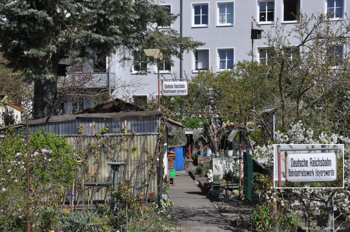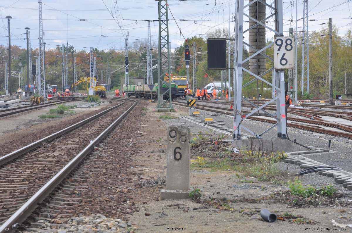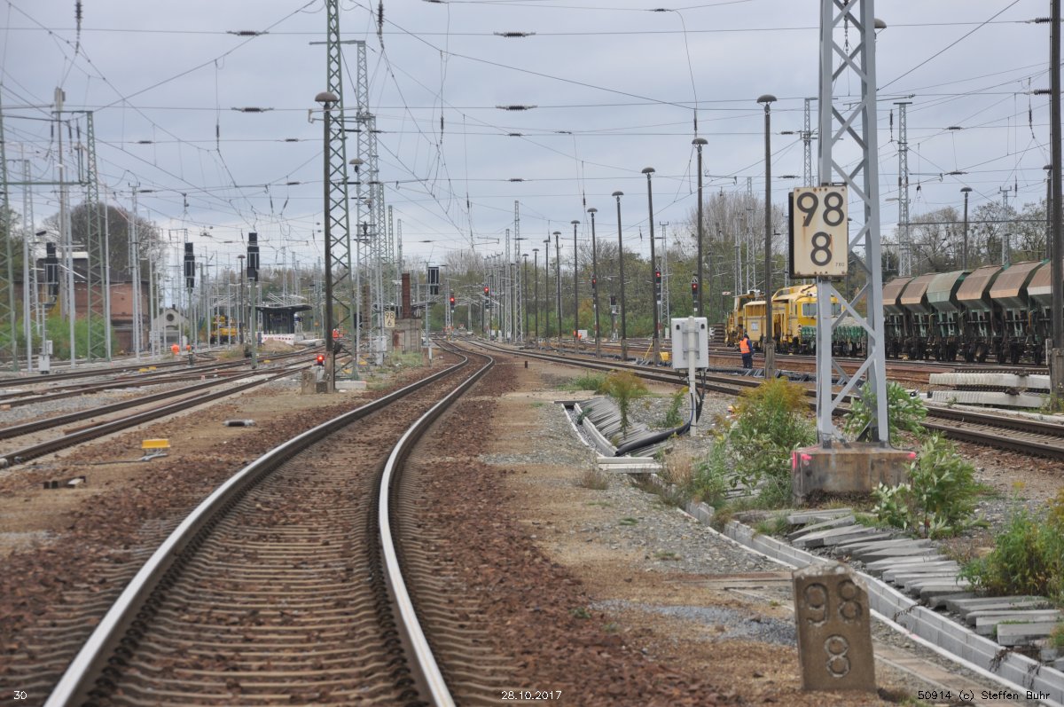 Das Gleis links war mal die 6198 (Südbahn, heute nur noch Ausziehgleis) und führte über die Brücke im Hintergrund,