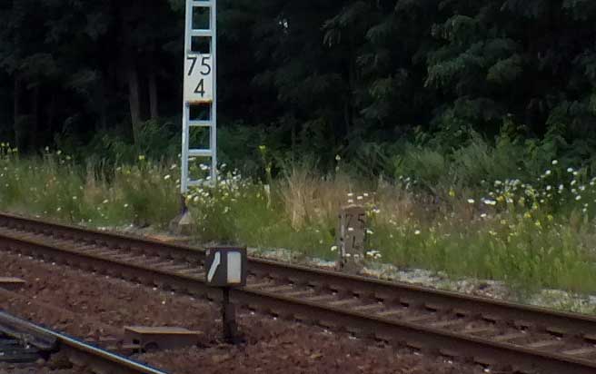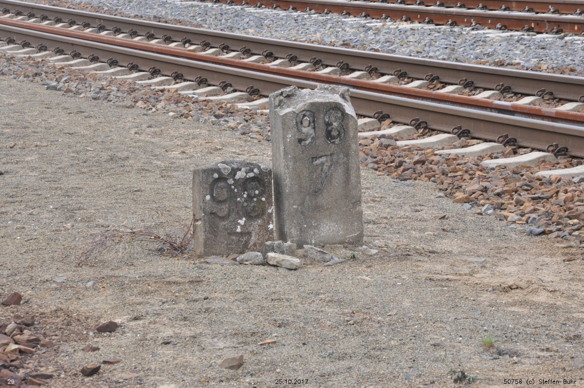 km 99,5 (Stein) und km 99,6 (Tafel) zwischen Ruhland und Lauchhammer Süd