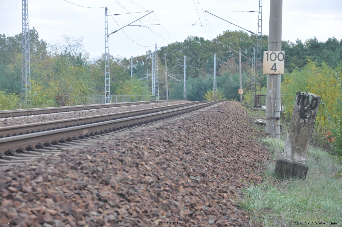 km 100,3 (Stein) und km 100,4 (Tafel) zwischen Ruhland und Lauchhammer Süd