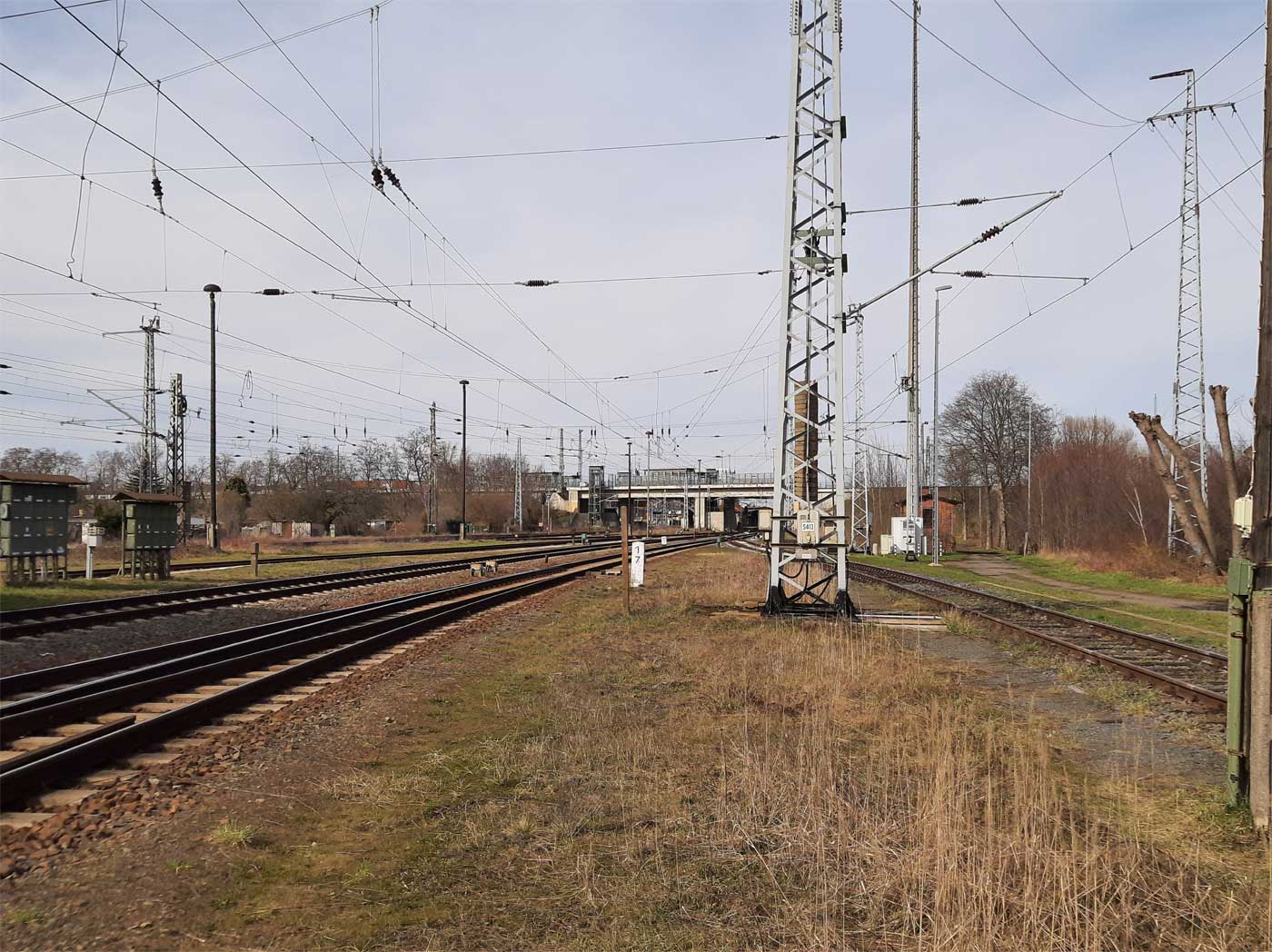 Im Hintergrund km 1,7 der Verbindungsstrecke Falkenberg (Elster), Stw W 2, W 519; km -0,021 - Weiche 2 - Weiche 3 - Falkenberg (Elster), Stw W 17, W415; km 1,714