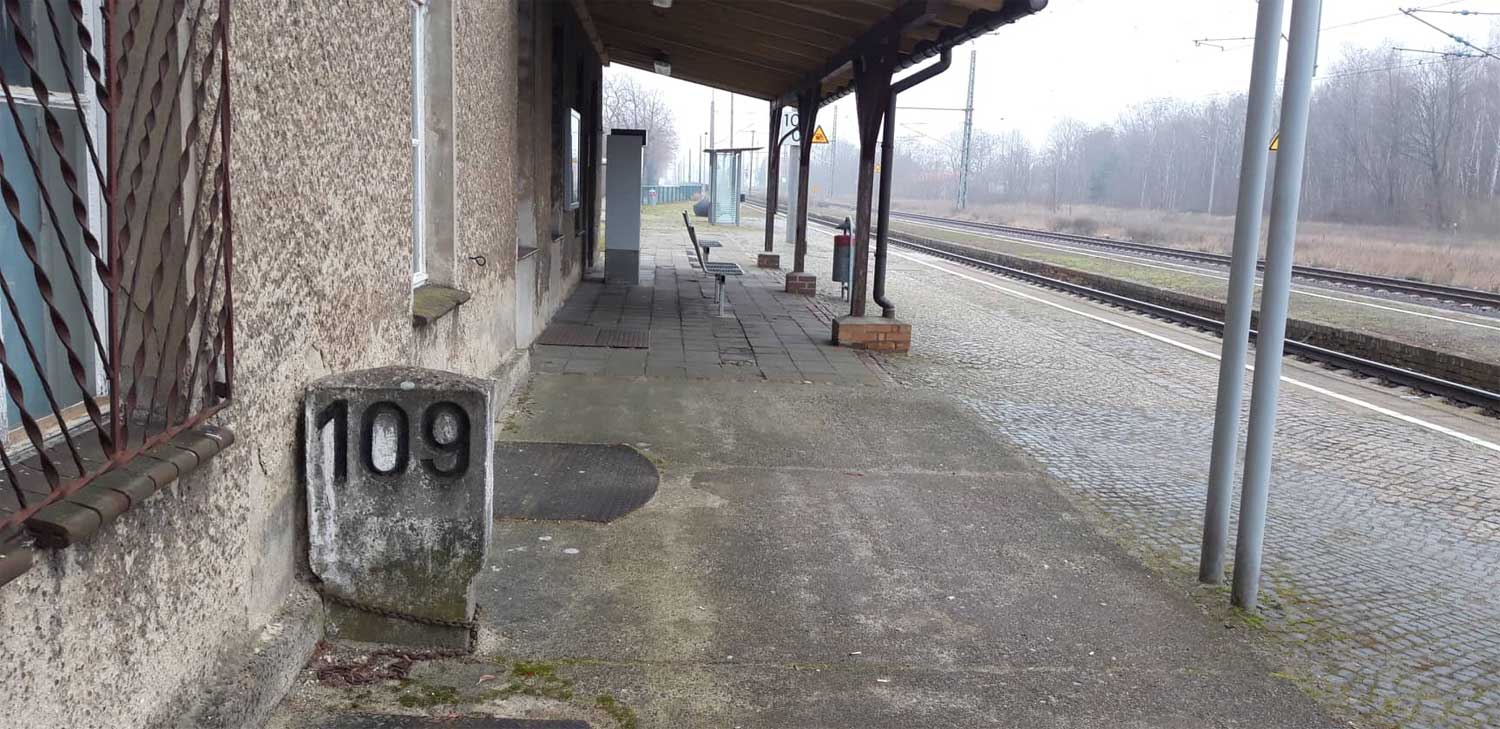 km 0,31 der Strecke Falkenberg (Elster) 0,31 - Uckro 49,39 - Luckau 57,39 - Lübben Hp 73,2 - Beeskow 113,662 | ||