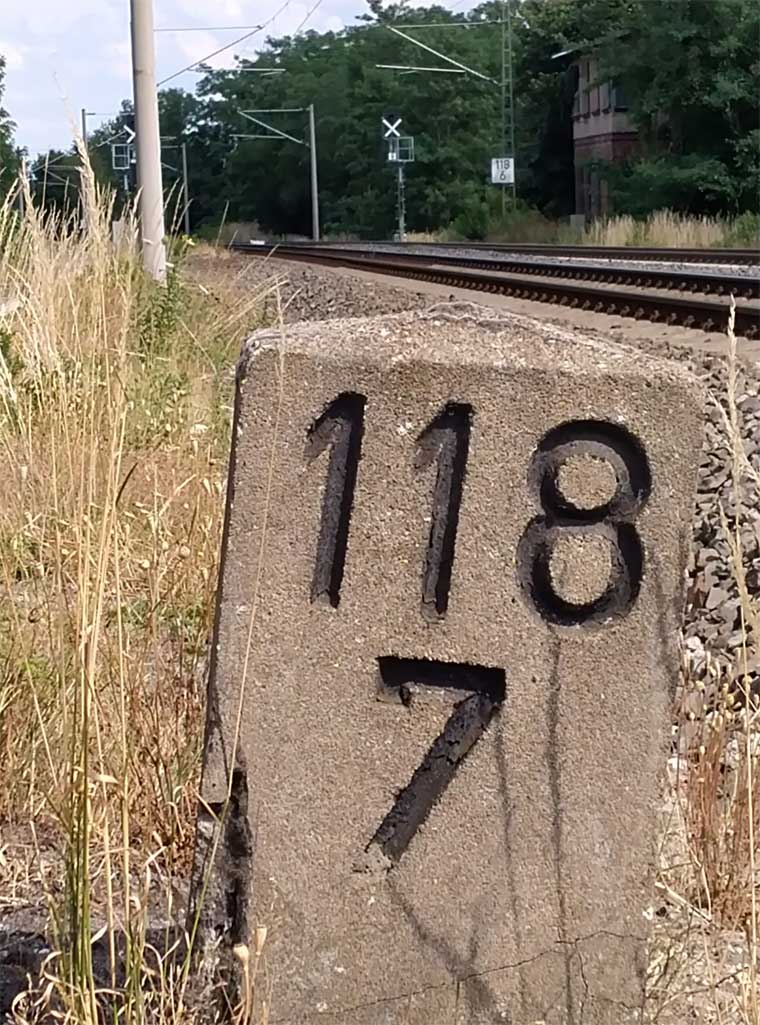 Roßlau (Elbe) | 233,67 | km 17,94 der Strecke (Biederitz 0,68 - Güterglück 25,87 - Landesgrenze Preußen/Anhalt km 30,320) = km 0,0 - Dessau Hbf 22,96 - Bitterfeld 48,51 - Leipzig Hbf 81,26 |