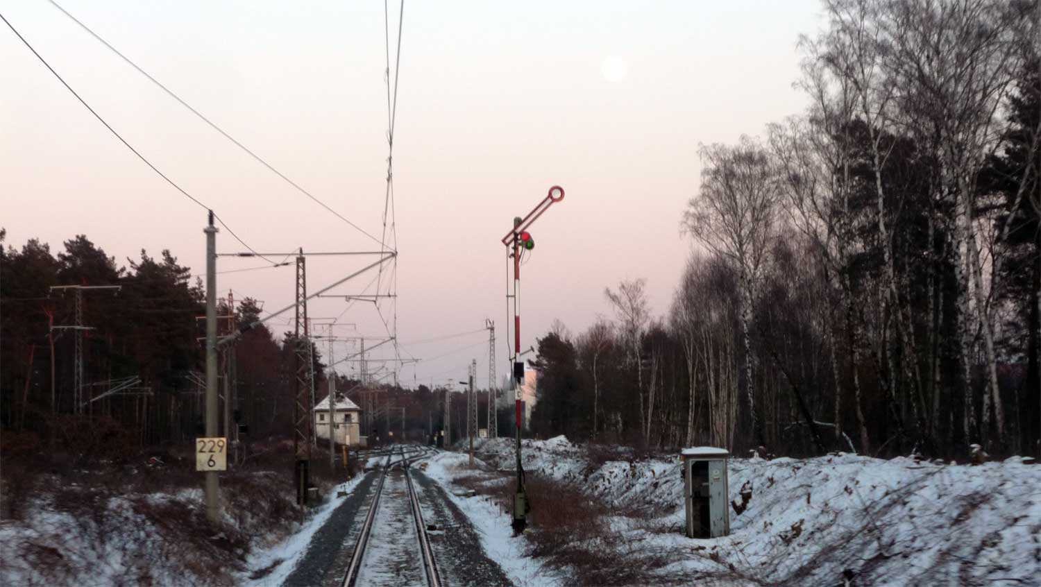 km 0,31 der Strecke Falkenberg (Elster) 0,31 - Uckro 49,39 - Luckau 57,39 - Lübben Hp 73,2 - Beeskow 113,662 | ||