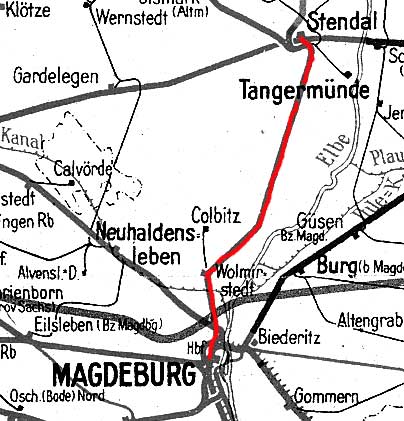 km 0,0 der Strecke Stendal 0,0 - Tangermünde 10,2 - Tangermünde Ladestellen am Elb- und Hafenufer 13,4 (Stendal-Tangermünder Eisenbahn-Gesellschaft) mit strategischer Verbindung (1944/1945) über die Elbe nach Fischbeck zur Strecke der Genthiner Eisenbahn AG