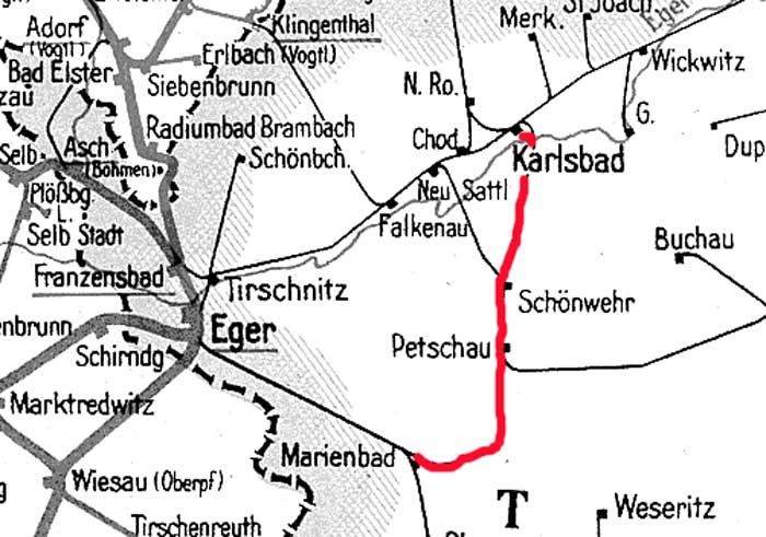 Marienbad Hbf (Mariánské Lázně) 0,0 - Petschau (Bečov nad Teplou) 33,218 - Schönwehr (Krásný Jez) 37,646 - Karlsbad unt Bf (Karlovy Vary dolní nádraží) 53,273
