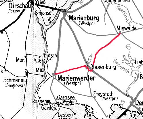 Marienwerder (Westpr) 0,0 - Riesenburg 20,9 - Miswalde 53,0 [Kilometrierung während der Zeit 1919-1939 (polnischer Korridor)]
