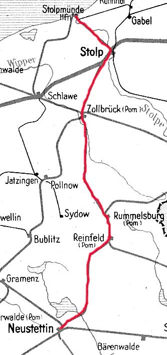 Neustettin 0,0 - Rummelsburg (Pom) 45,10 - Zollbrück (Pom) 81,86 - Stolp (Pom) 104,32 - Stolpmünde 121,47 (1937)