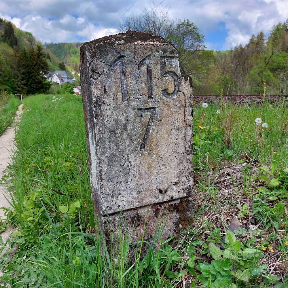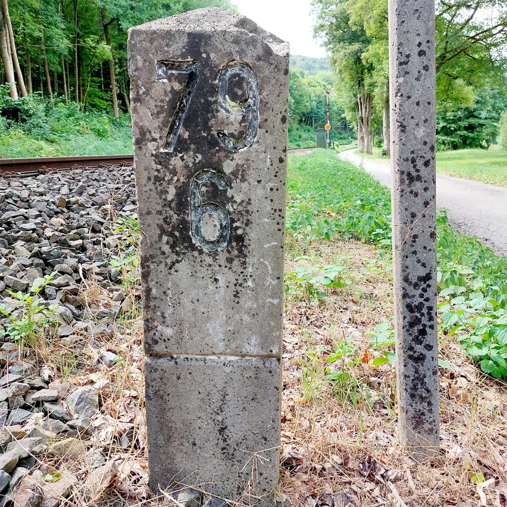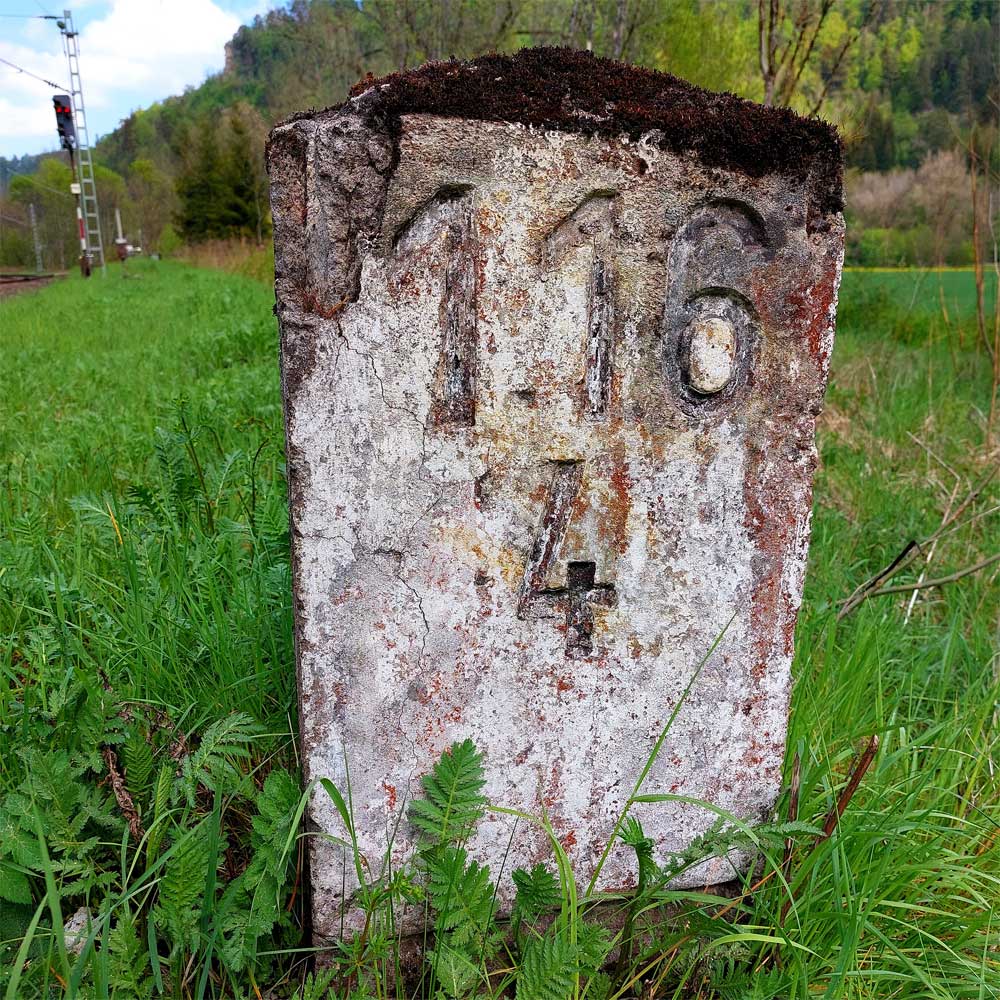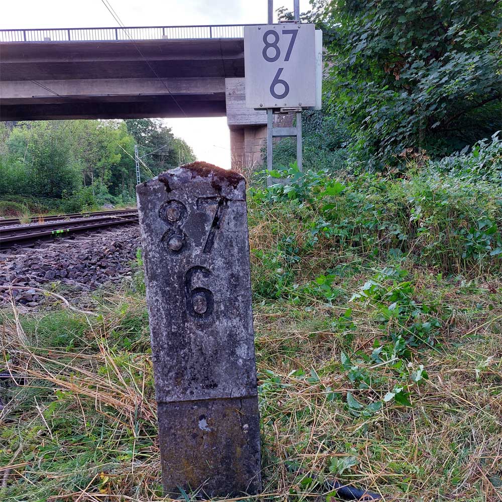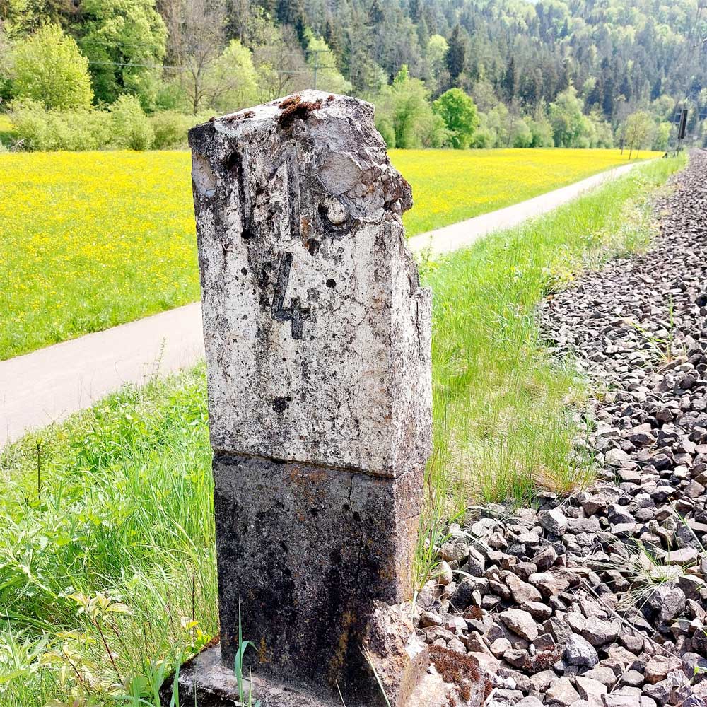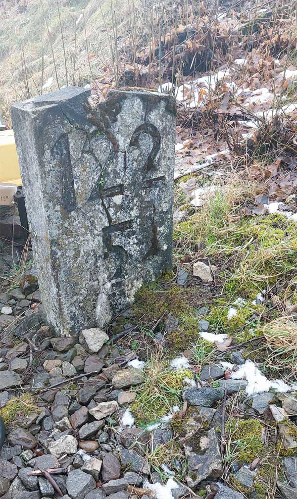 Am linken Bildrand ist ein Kilometerstein zu erkennen.