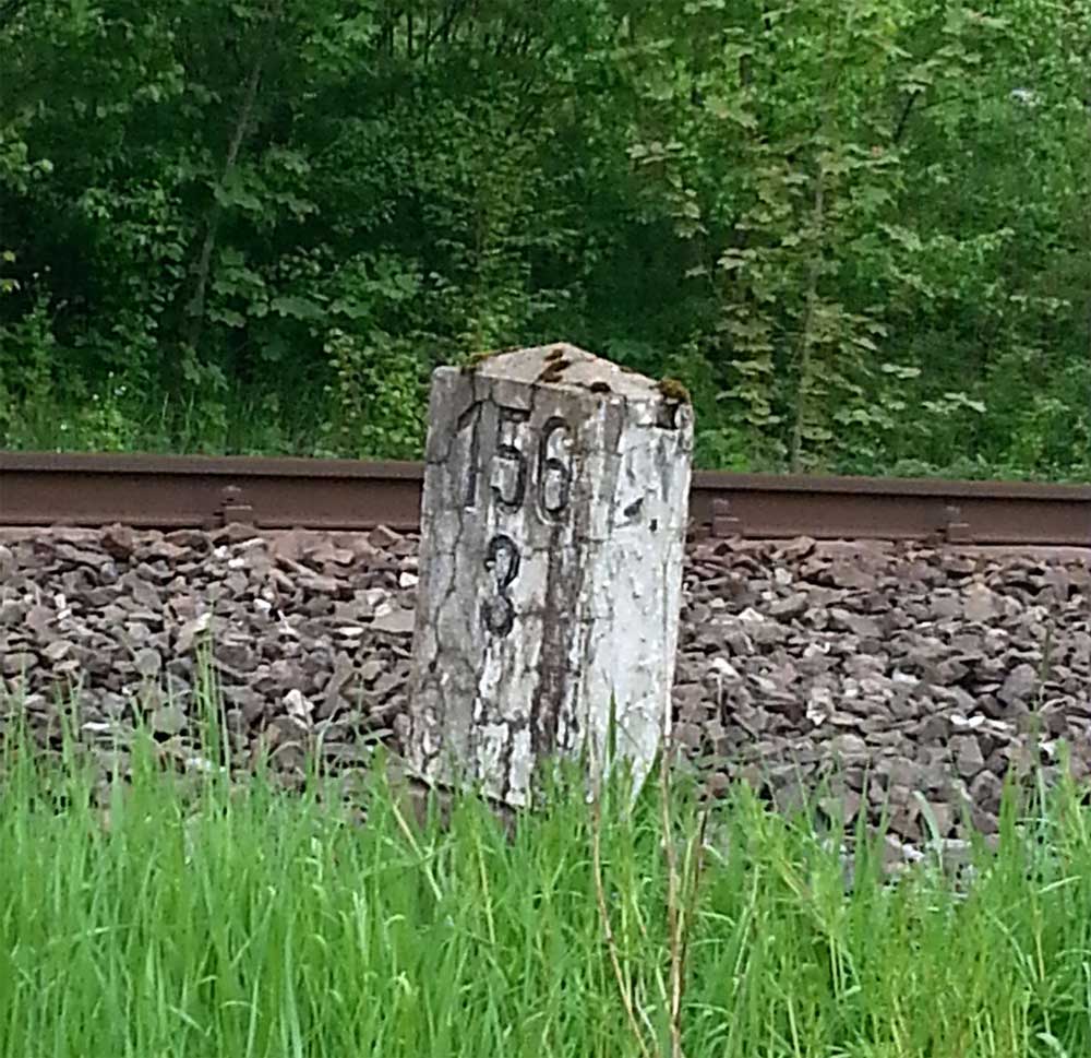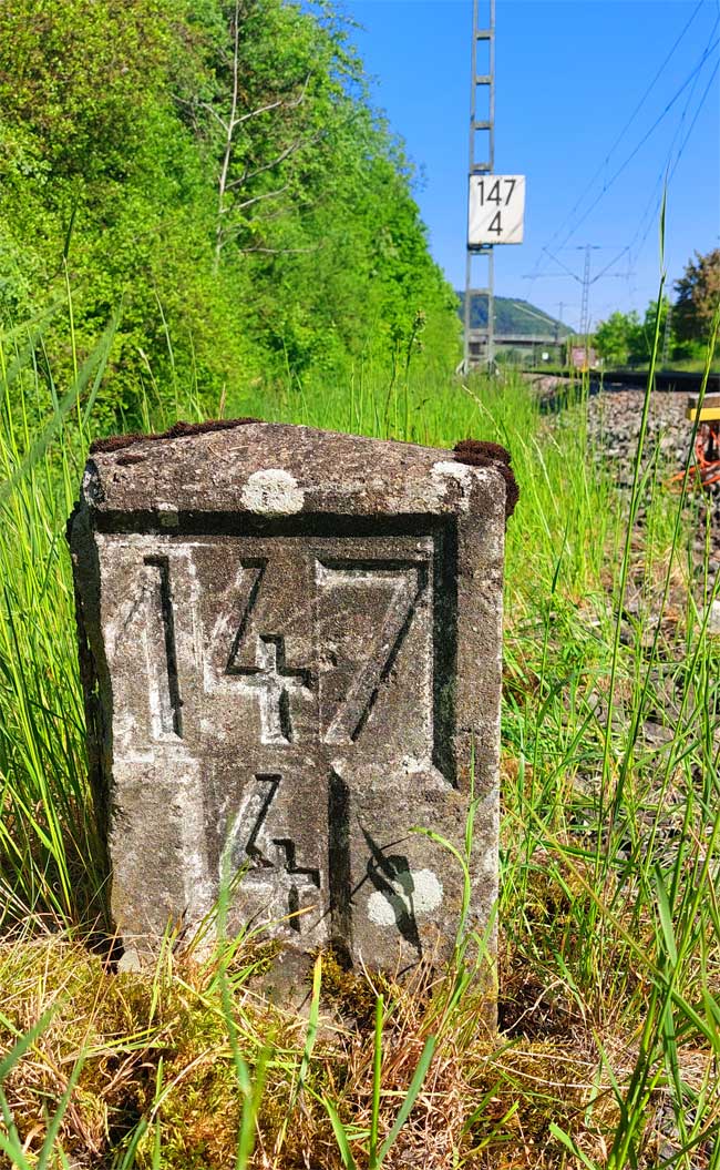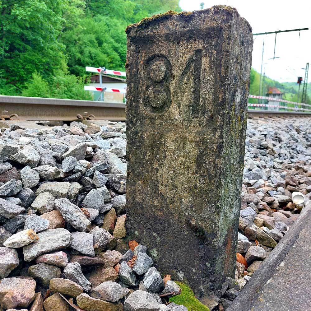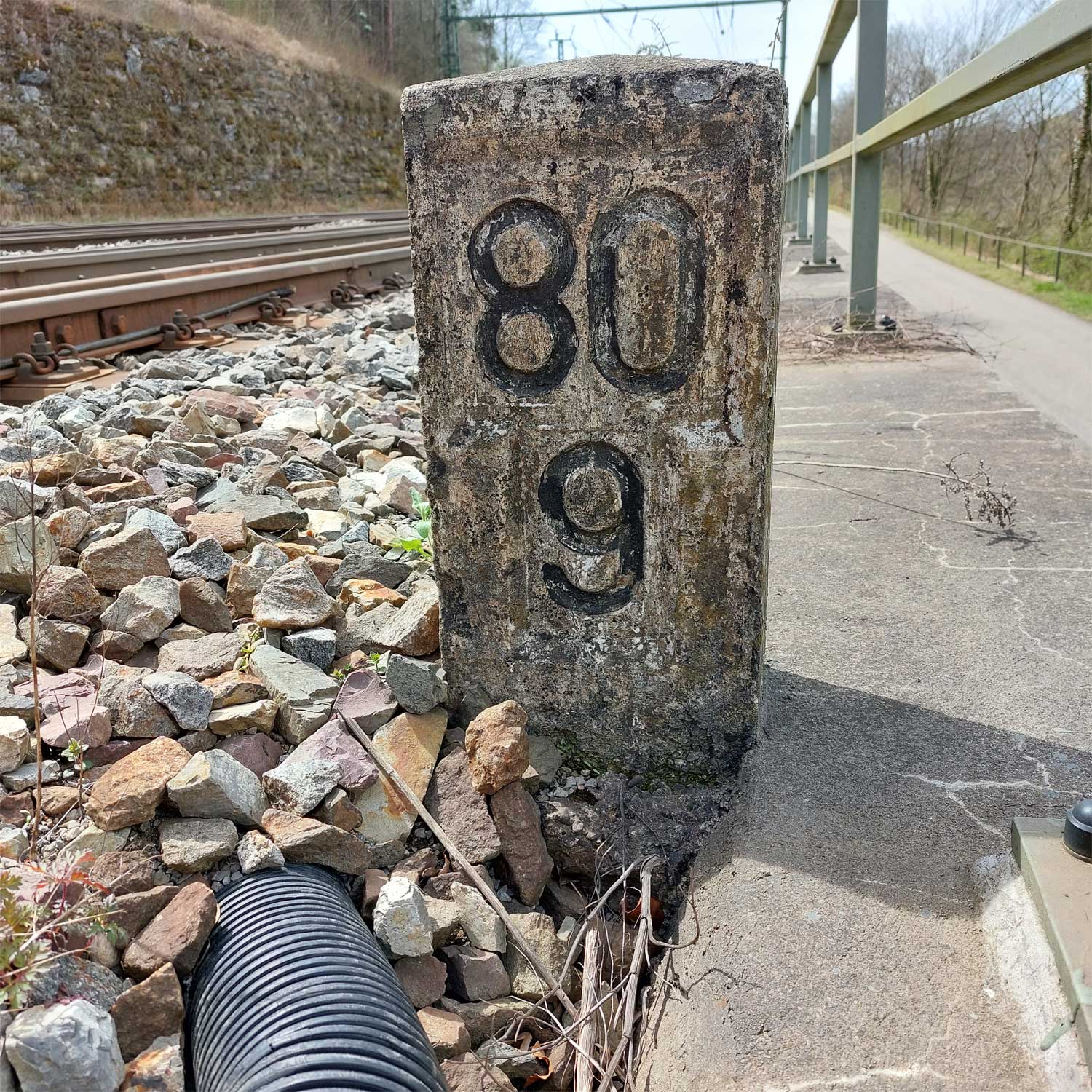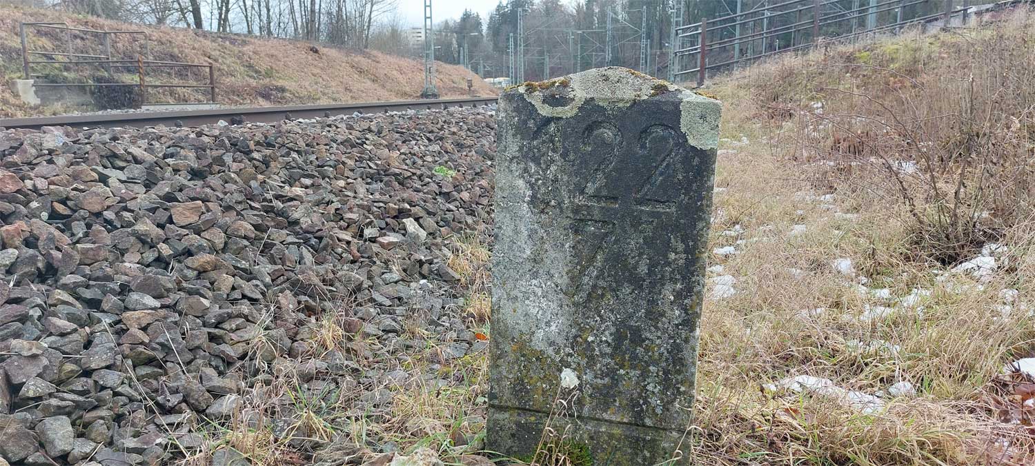 Am linken Bildrand ist ein Kilometerstein zu erkennen.