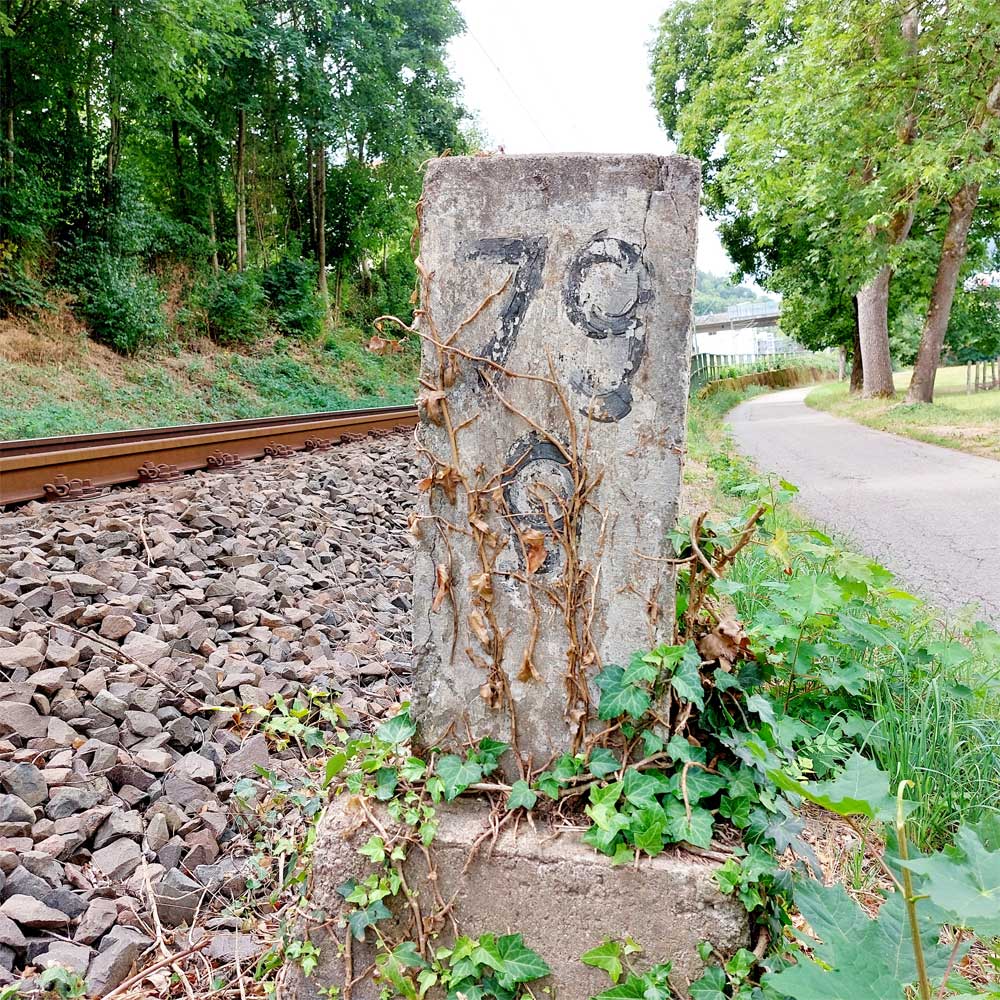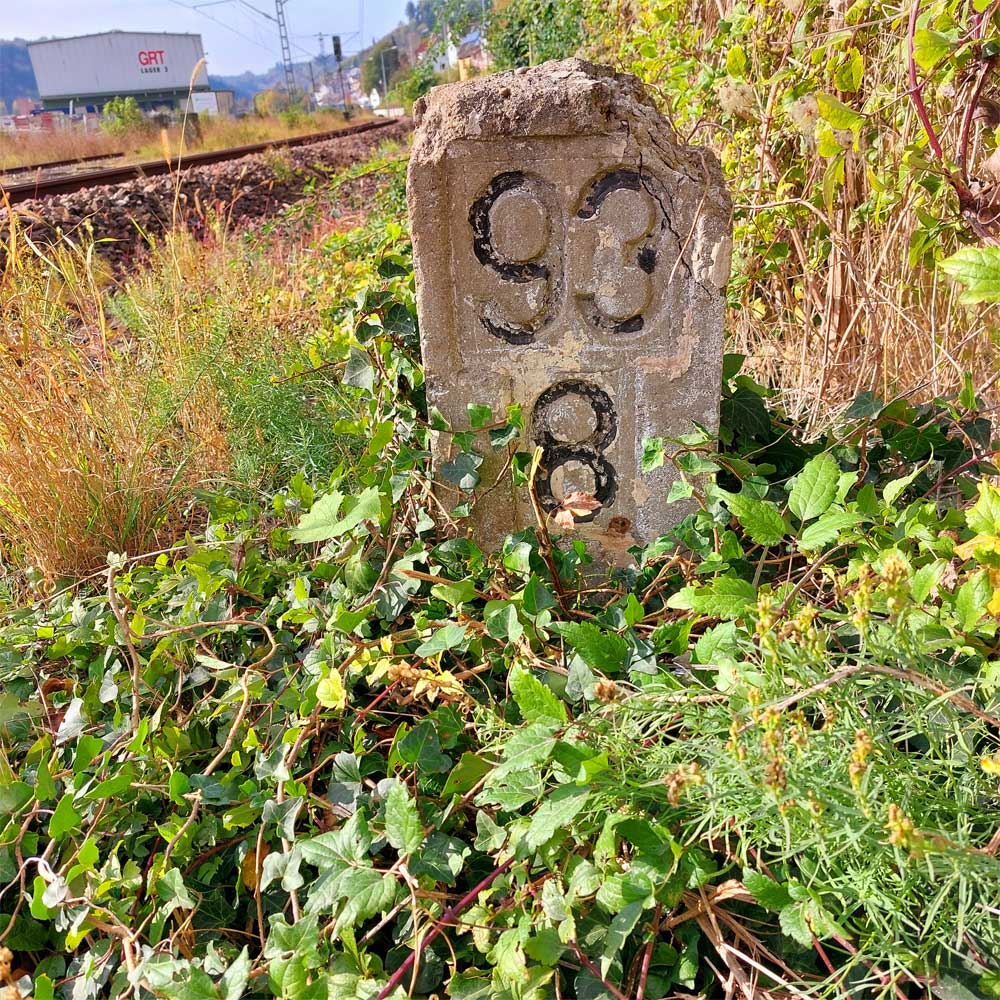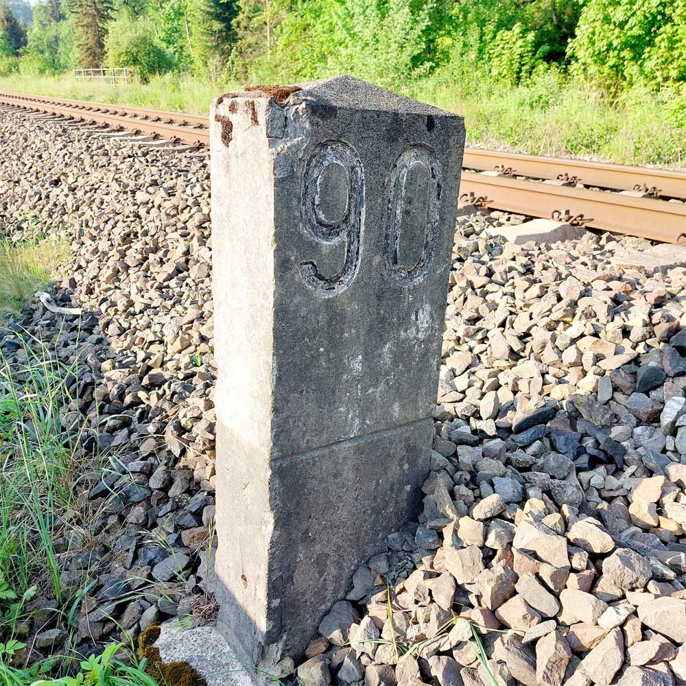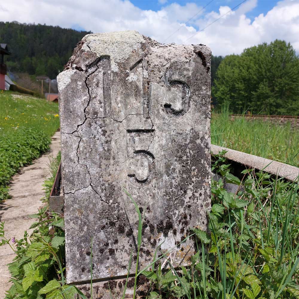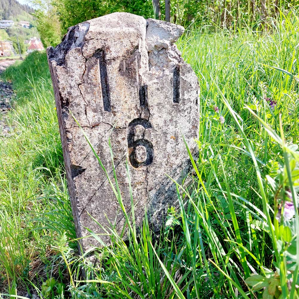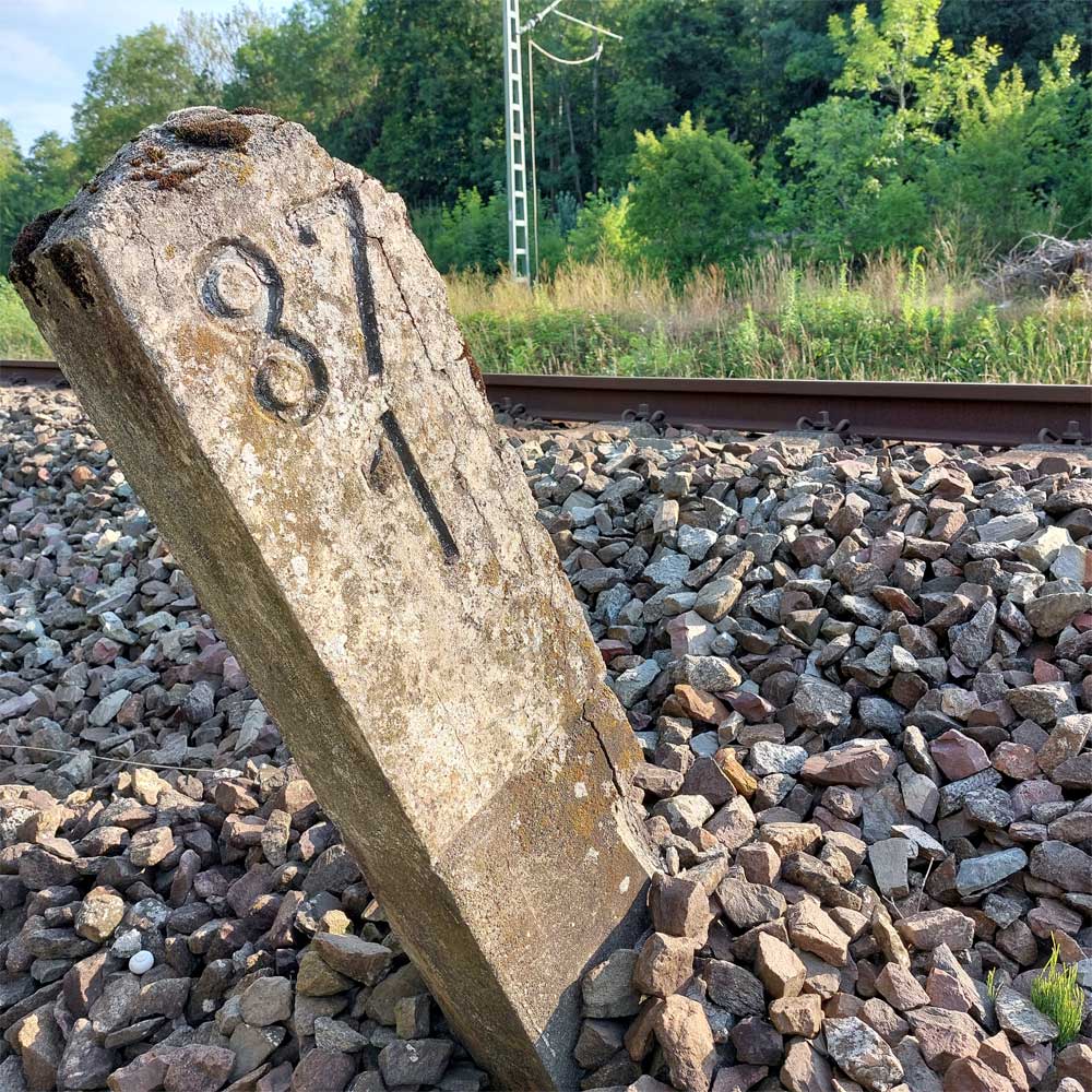 Am linken Bildrand ist ein Kilometerstein zu erkennen.