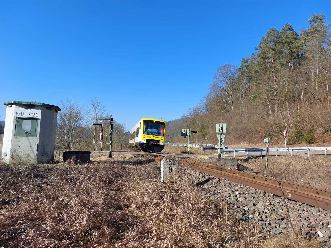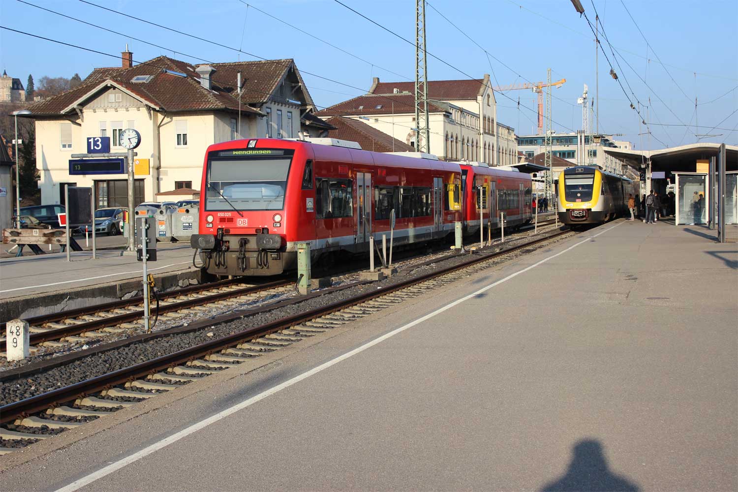 Der Zug links befindet sich auf der Strecke Rottweil 0,0 - Villingen (Schwarzw) 26,867