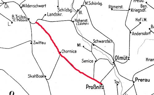 Proßnitz Hauptbahnhof / Prostějov hlavní nádraží 0,0 - Grenze Protektorat Böhmen und Mähren/Sudetenland 31,3 - Kornitz 40,530 - Triebitz 76,631