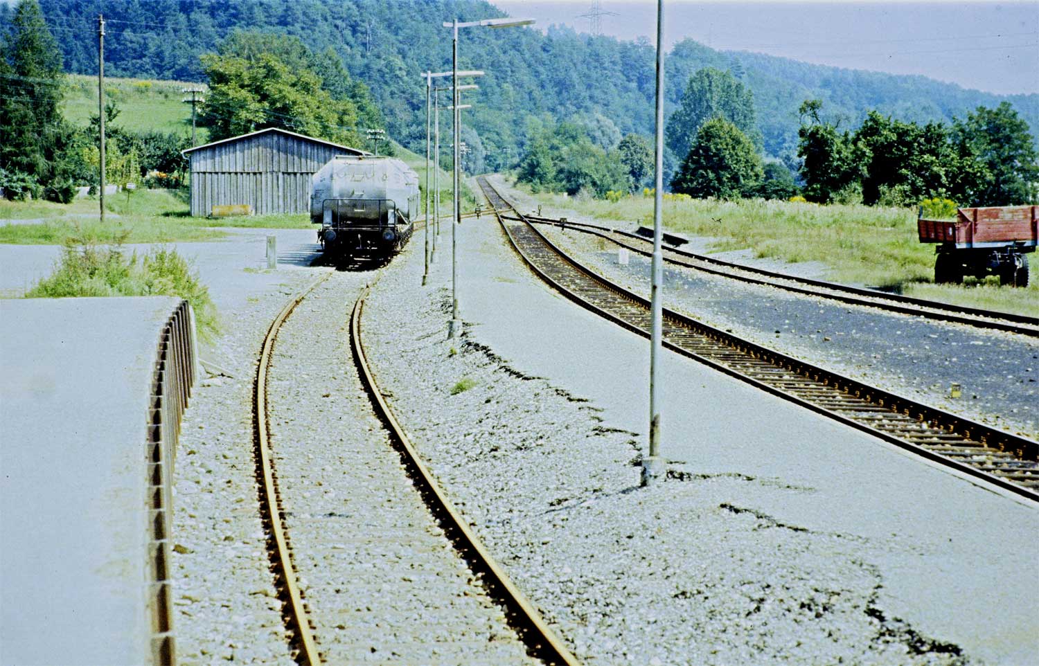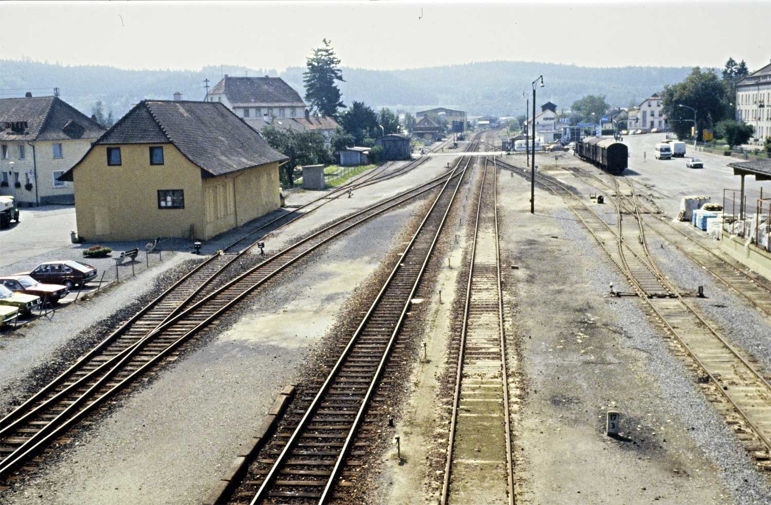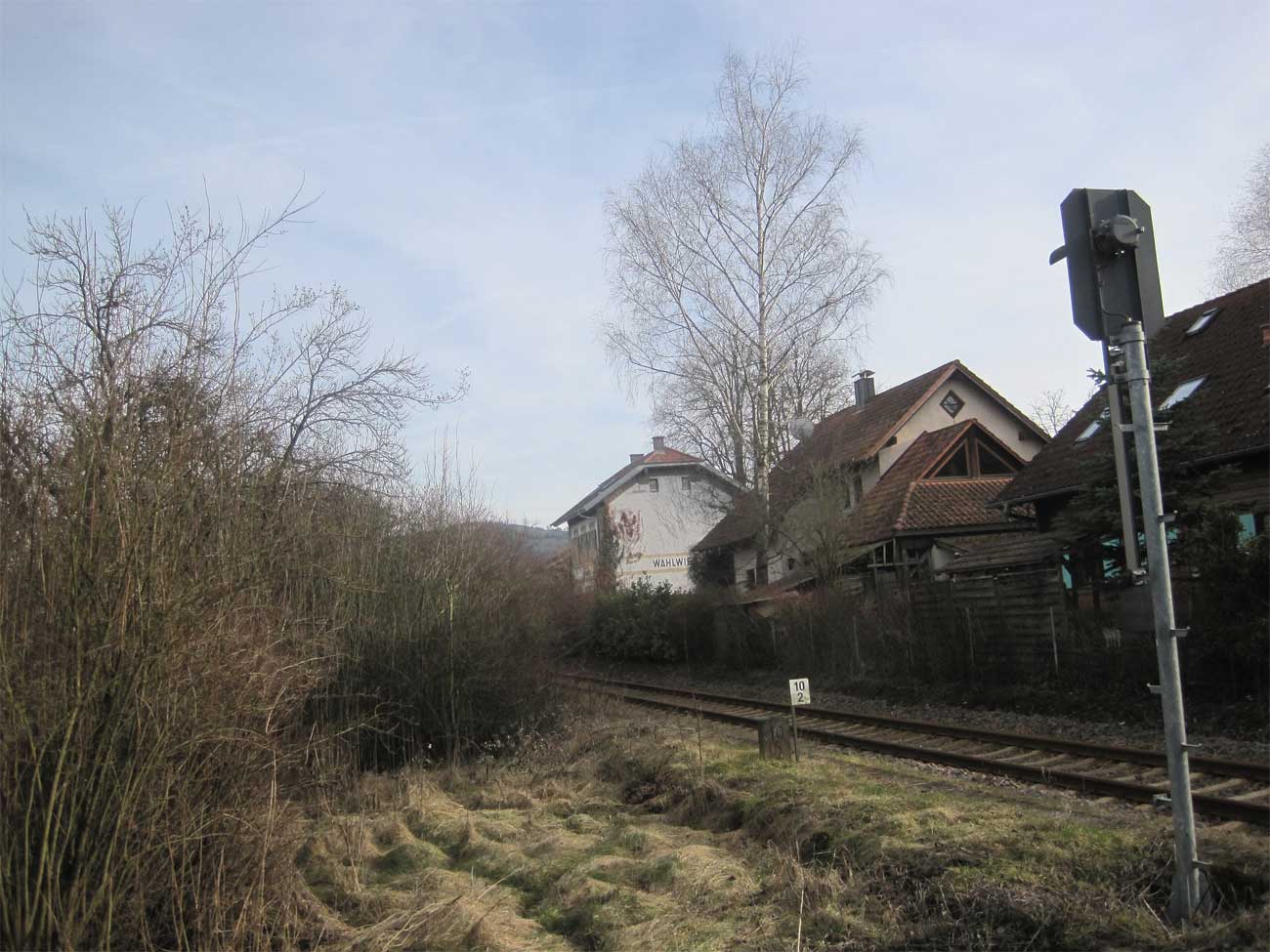 Im Hintergrund das ehemalige Bahnhofsgebäude