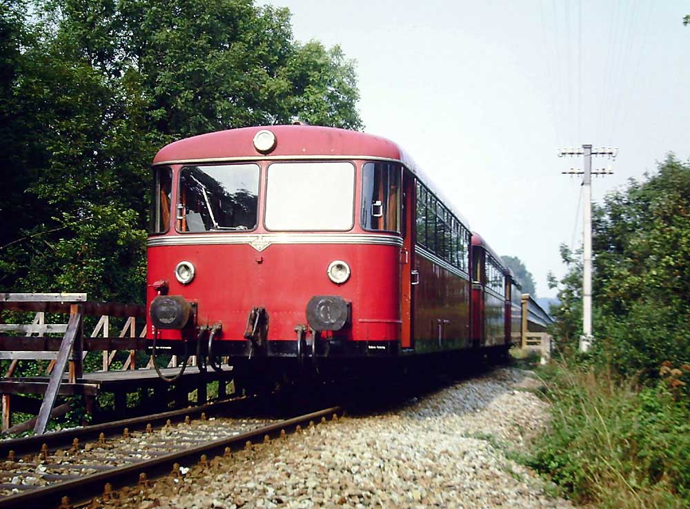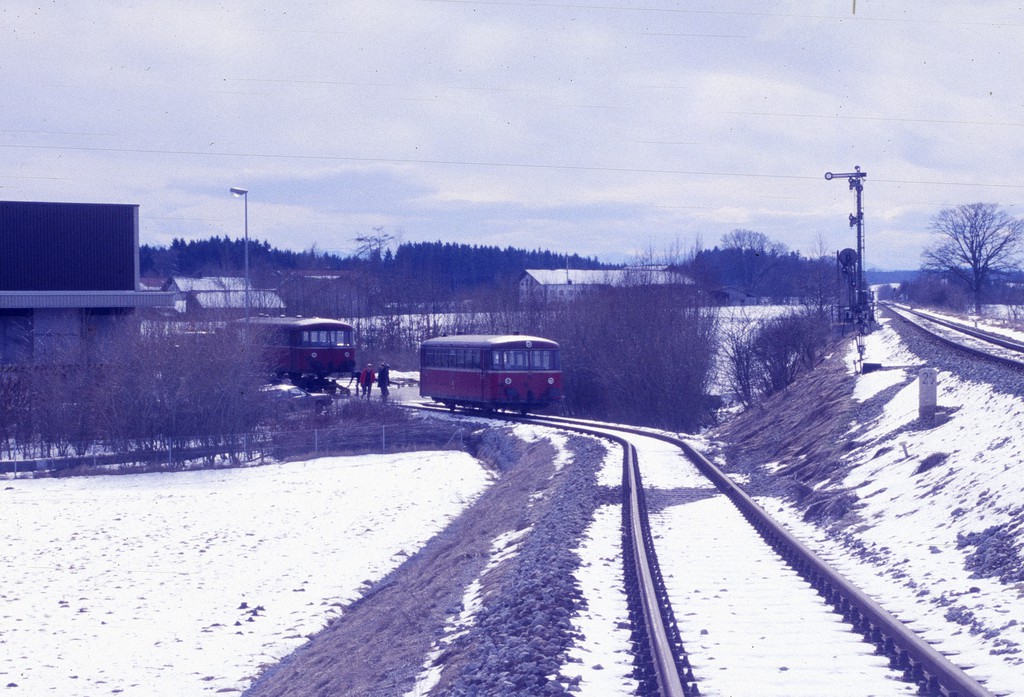 Gute alte Eisenbahnzeit? Mitte der 80er mitnichten noch auf allen Strecken. Die Nebenbahn Rosenheim – Mühldorf - Plisting hatte in dieser Zeit ein ganz besonderes Kuriosum zu bieten. Die Strecke wies sich in „indirekter Proportionalität“ gegenüberstehende Verkehrsströme und Kunstbauten auf. Sprich – los war nix, aber der Streckenunterhalt aufgrund einer großer Innbrücke relativ aufwendig. Als nun die ein Schaden an der Brücke auftrat, wurde die Strecke für Jahre unterbrochen. Soll man es nun als „besonders flexibel“, oder aber als Armutszeugnis bezeichnen, was man bei der DB daraufhin anstellte? Beidseits der Widerlager wurden provisorische Bahnsteige erreichtet, die Brücke mit Holz verkleidet und überdacht, damit es keinem „Anders“ wurde in diesen schwindelnden Höhen, und die Fahrgäste legten die mehreren hundert Meter also zu Fuß zurück. Dort wartete dann wieder der „Anschluss-Zug“. 798 764 steht hier mit ihrem N5371 am Halt „Innbrücke Süd“ und wartet auf „Wandergäste“ von Innbrücke Nord.