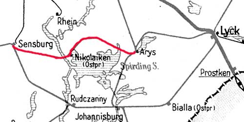 km 32,6 der Strecke Rastenburg Kleinbf 0,0 - Sensburg Reichsbf 32,6 (Rastenburger Kleinbahnen; ab 1924 Ostpreußische Kleinbahnen AG) Spurweite 750 mm