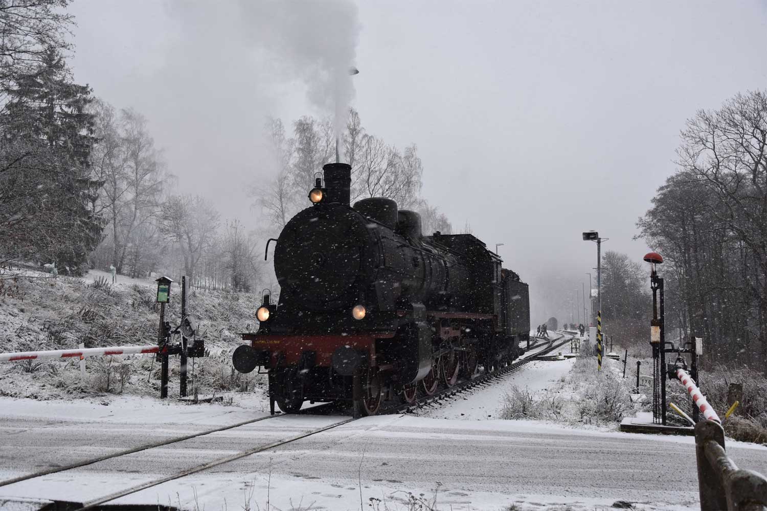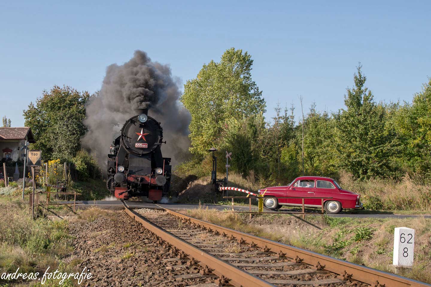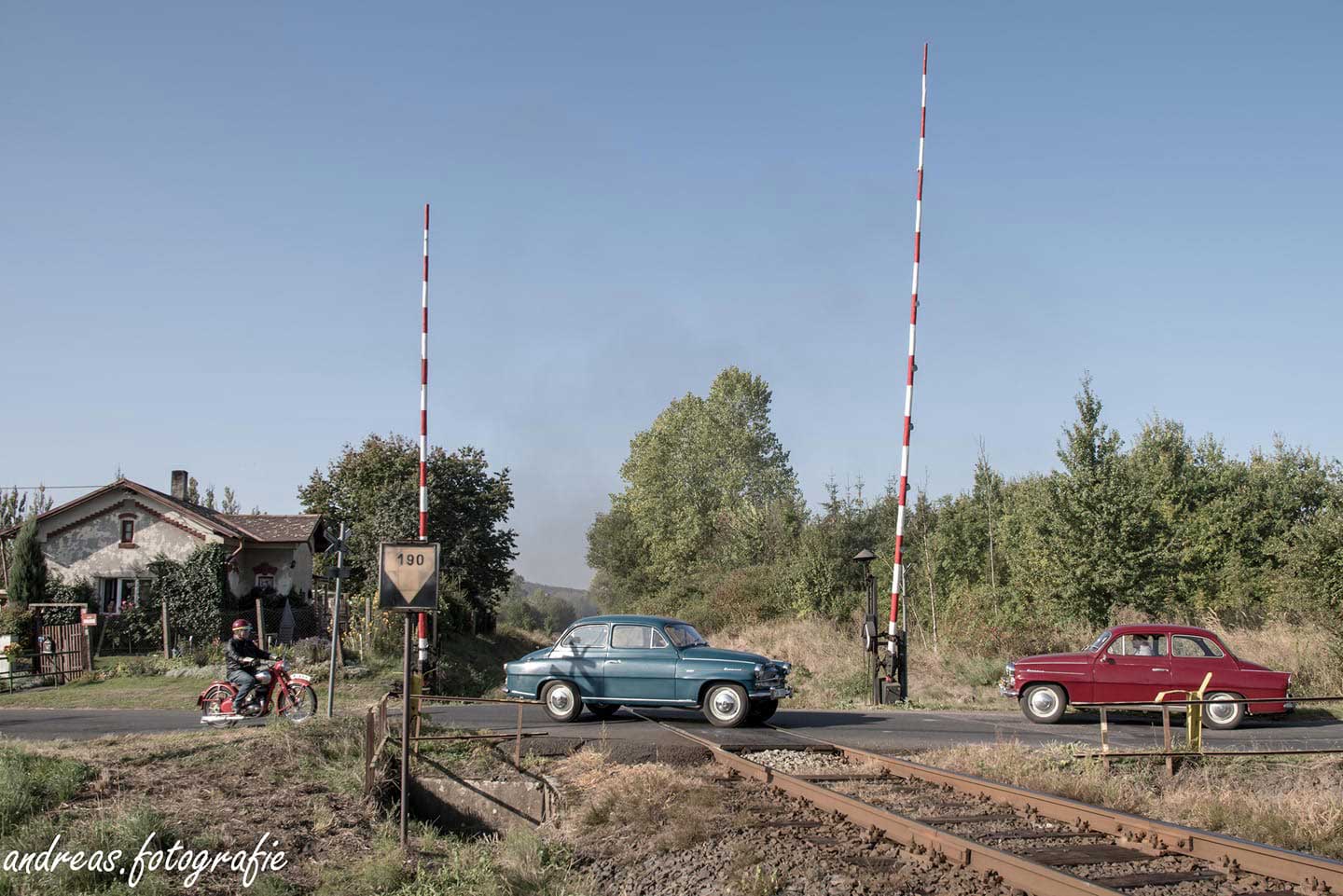 Beachtenswert sind die Holzschranken und auch der Neigungsanzeiger und natürlich die Lok und die historischen Fahrzeuge.