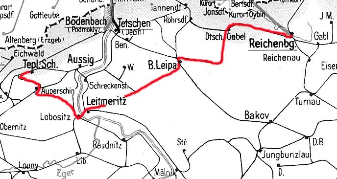 Settenz (Řetenice) 0,0 - Lobositz (Lovosice) 36,37 - Böhmisch Leipa (Česká Lípa hl. N.) 84,96 - Deutsch Gabel (Jablonné v Podještědí) 114,557 - Reichenberg (Liberec) 145,107