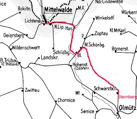 Šternberk (Sternberg) 0,0 - Šumperk (Mährisch Schönberg) 43,807 - Hanušovice (Hannsdorf) 70,102 - Dolní Lipka (Nieder Lipka) 90,268 - Lichkov (Lichtenau) 95,123