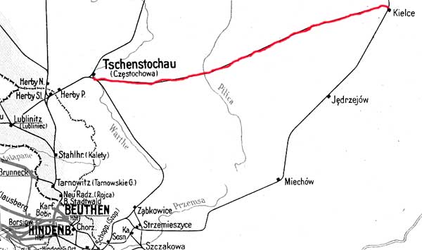 Auszug Streckenkarte 1938 Quelle: [1] Stand der Kilometrierung: 1943 Tschenstochau 0,0 - Kielce 117