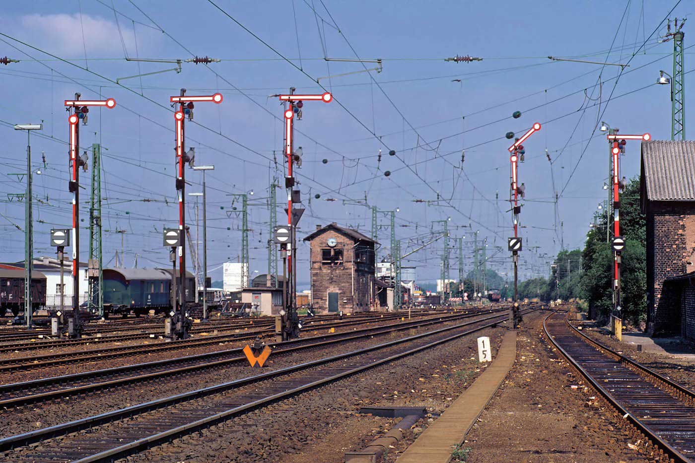 km 0,0 der Strecke Worms 0,0 - Hofheim (Ried) 5,61 - Biblis 10,04 mit Zweigstrecke (Worms 0,0) - Hofheim (Ried) 5,61 - Bensheim 23,90