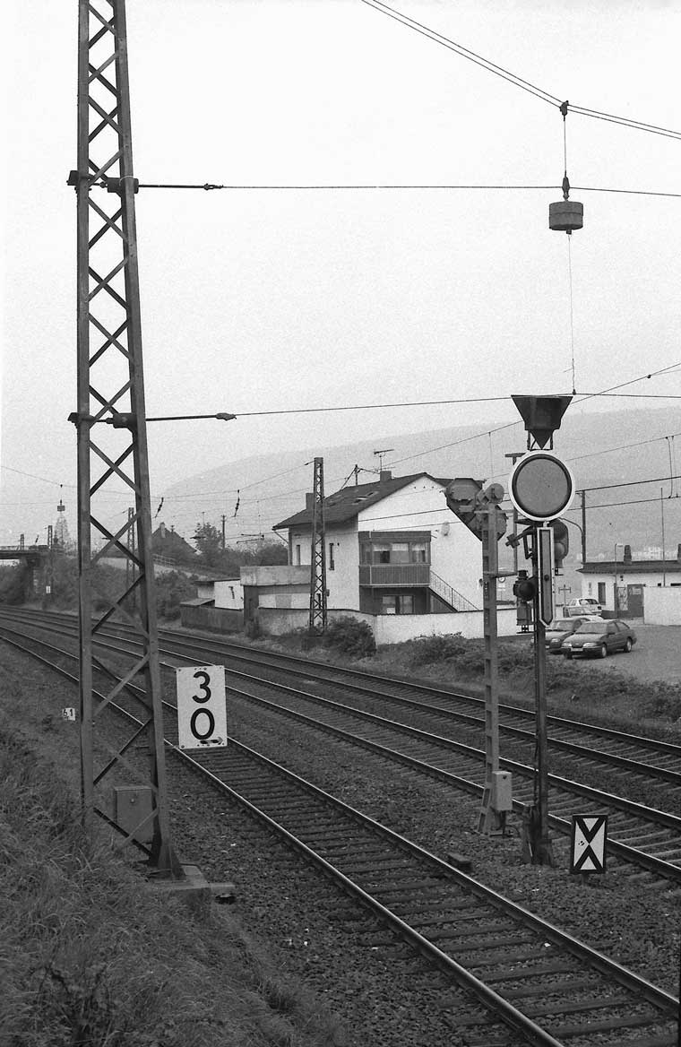 Bingen (Rhein) Stadt 63,29 km 0,97 der Strecke [Köln Hbf -2,06/-1,44 - Koblenz Hbf 91,20 - Bingen (Rhein) Hbf 152,00] - ehemalige Landesgrenze Preußen/Hessen (Mitte Nahebrücke) km 152,41 = km 0,0 - Bingen (Rhein) Stadt 0,97 - Mainz Hbf 30,59 (2630/3510)