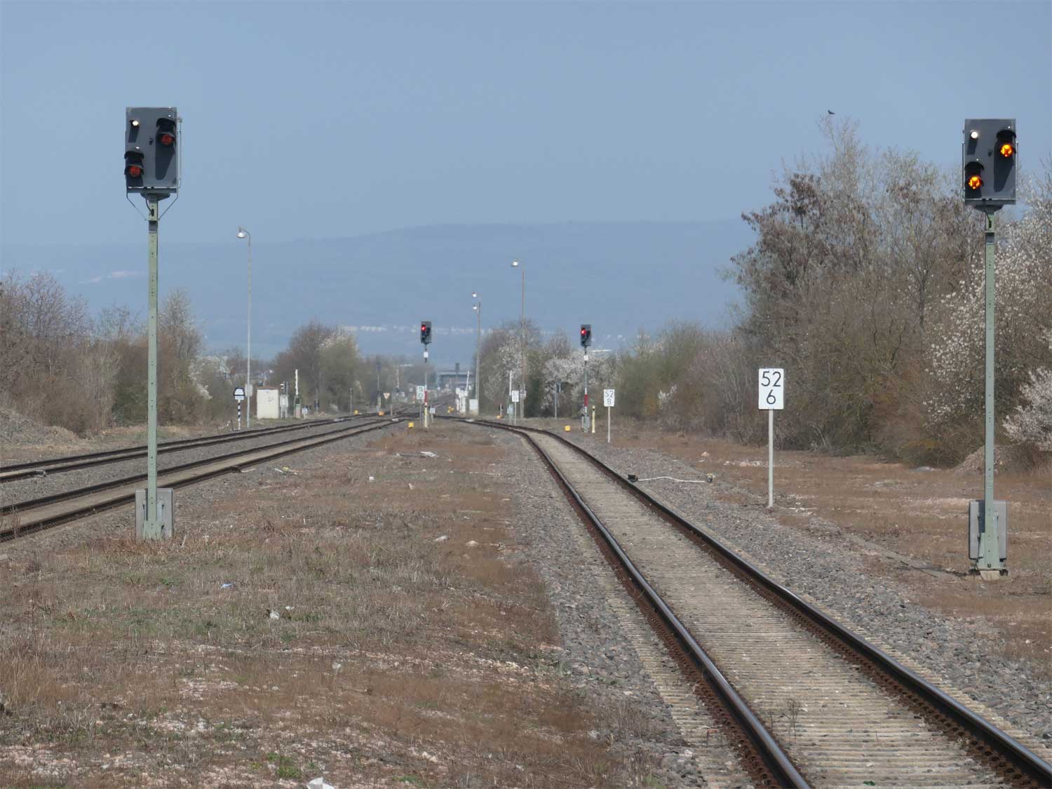 km 56,293 (Spitze der vorderen Weiche) am Abzw Büdesheim-Dromersheim - Blick Richtung Worms