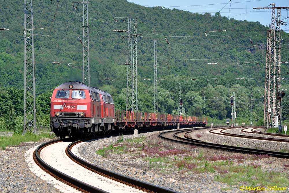 Die Kilometertafel (rechts hinter dem Obeleitungsmast) gehört zur Strecke