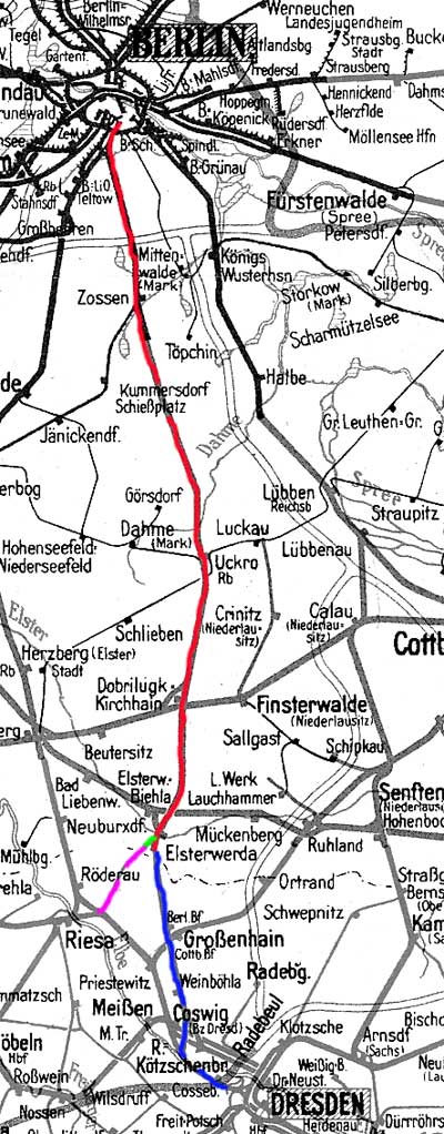 [Berlin Anhalter Bf (bis 1882 Berlin Dresdner Bf) 0,01] - Abzw Berlin-Mariendorf 6,93 - Berlin-Marienfelde 9,40 - Luckau-Uckro 76,00 - Elsterwerda 122,75 - ehem. Landesgrenze Preußen/Sachsen km 124,56 = km 50,36 - Großenhain Berliner Bf 33,52 - Dresden-Friedrichstadt 0,26 - km 0,0 bei Dresden-Friedrichstadt (Streckenwechsel auf 6244) = km 0,0 - Abzw Dresden Mitte 0,80 (6135/6248/6244)