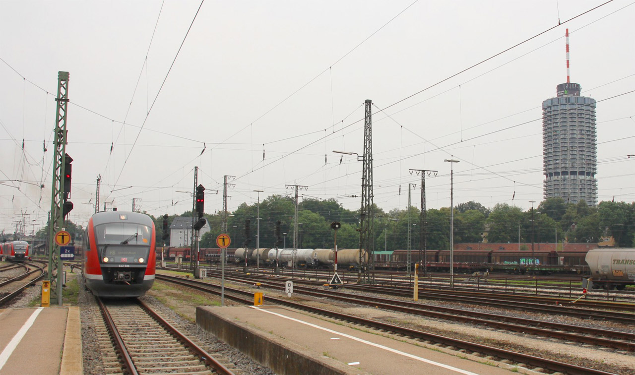 Augsburg Hbf 0,0 km 0,0 der Strecke Augsburg Hbf 0,0 - Neu-Ulm 83,77 - Landesgrenze Bayern/Württemberg 85,001 [=km 94,950 - Ulm Hbf 93,98 - (Stuttgart Hbf 0,0)] (siehe auchTabelle 3, Ziffer 10)