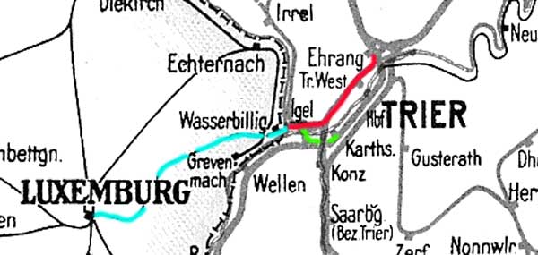 Karthaus 0,0 - Igel 5,190 - Grenze Preußen/Luxemburg 7,217 = km 37,442 - Wasserbillig 36,884 - Luxemburg 0,0