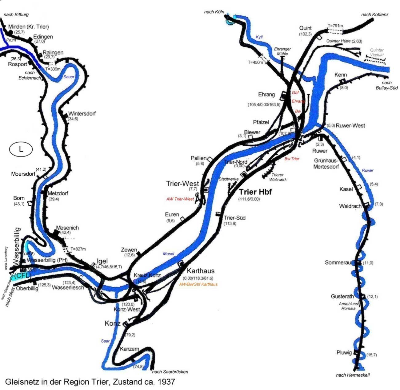 Ehrang 0,0 - km 3,27 = km 2,98 (ehemals Abzw Biewer) - Igel 15,64 - Grenze Deutschland/Luxemburg 19,163 =