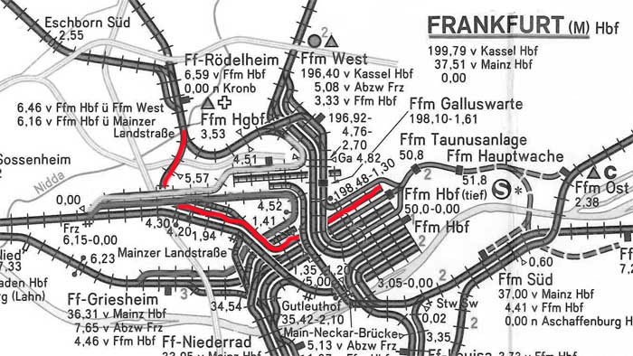 Frankfurt (Main) Hbf 0,0 - Abzw Mainzer Landstraße 2,98 - Abzw bei Frankfurt (Main)-Rödelheim (Niddabrücke) 6,46 (3613)