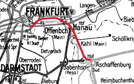 Hanau Hbf 19,95 km 22,97 der Strecke Frankfurt (Main) Hbf 0,0 - Hanau Hbf 22,97 - Schlüchtern 74,34 - (bis 1913: Elm 82,0 - Flieden 92,3) - (ab 1913 Distelrasentunnel) Flieden 85,240 = 92,195 (siehe auch Tabelle 5, Ziffer 3) - Fulda 110,57 - Bebra 166,667 - Eichenberg 227,37 - Göttingen 247,11