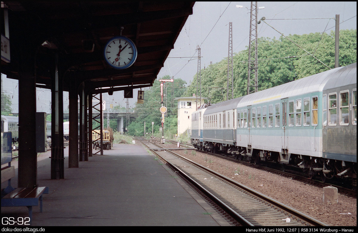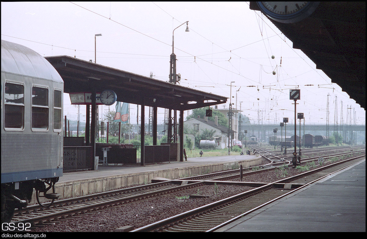 Hanau Hbf 19,95 km 22,98 der Strecke Frankfurt (Main) Hbf 0,0 - Hanau Hbf 22,98 - Schlüchtern 74,34 - (bis 1913: Elm 82,0 - Flieden 92,3) - (ab 1913 Distelrasentunnel) Flieden 85,240 = 92,195 (siehe auch Tabelle 5, Ziffer 3) - Fulda 110,57 - Bebra 166,667 - Eichenberg 227,37 - Göttingen 247,11